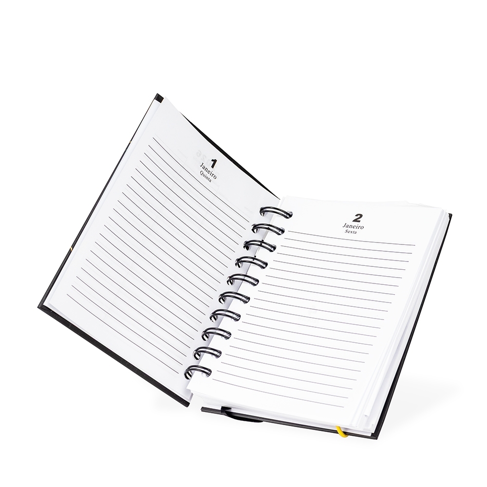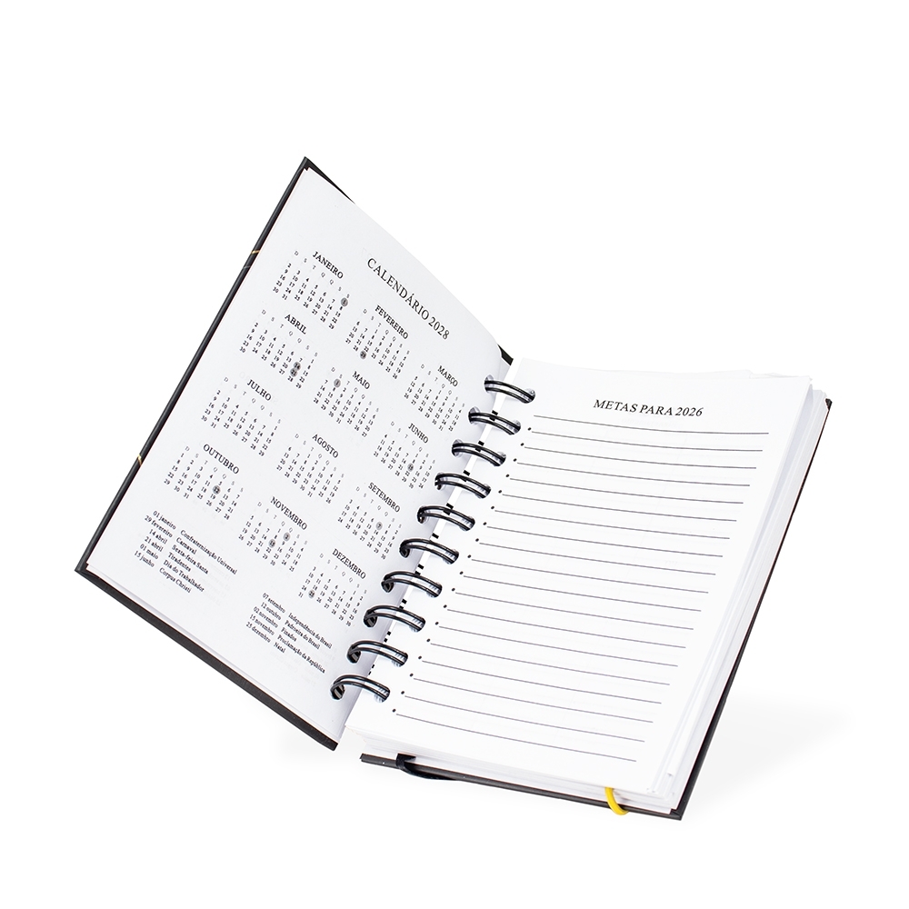 Agenda diária 2026 com capa dura, elástico de fechamento, marca-páginas de fita de cetim e encadernação Wire-O. Conta ainda com páginas dedicadas a dados pessoais, calendários de 2026 até 2028, além de listas de metas, planejamento mensal e contatos.