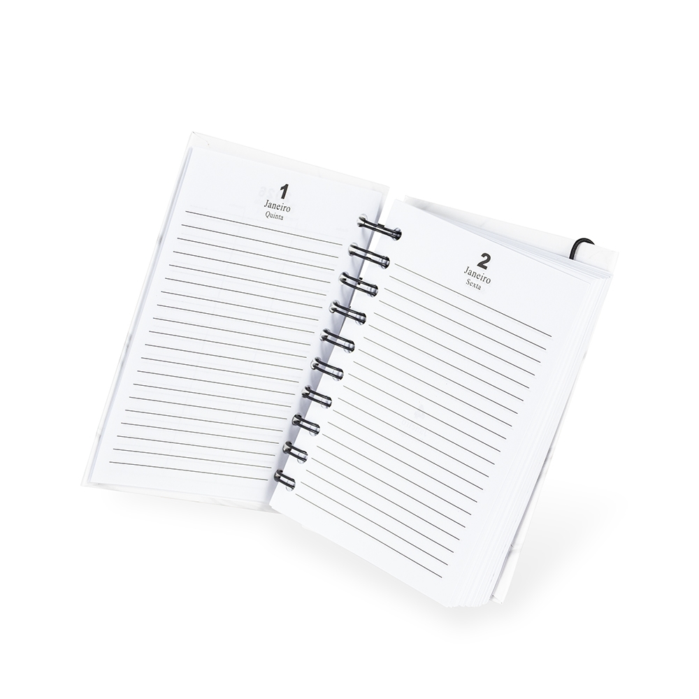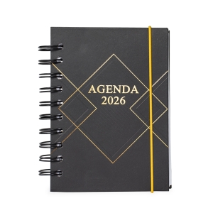 Agenda diária 2026 com capa dura, elástico de fechamento, marca-páginas de fita de cetim e encadernação Wire-O. Conta ainda com páginas dedicadas a dados pessoais, calendários de 2026 até 2028, além de listas de metas, planejamento mensal e contatos.