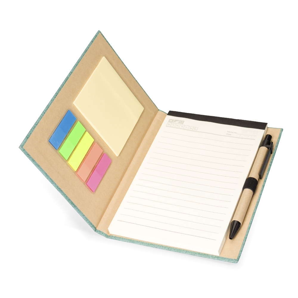 Bloco de anotações com capa dura revestida em papel especial e fita elástica para fechamento. Possui cerca de 80 folhas pautadas, além de um bloco com aproximadamente 20 folhas autoadesivas amarelas e por volta de 100 marcadores de página autoadesivos, divididos em cinco cores diferentes. Acompanha uma caneta esferográfica com carga azul de 1.0mm e acionamento por clique, corpo em papelão e demais componentes em plástico.