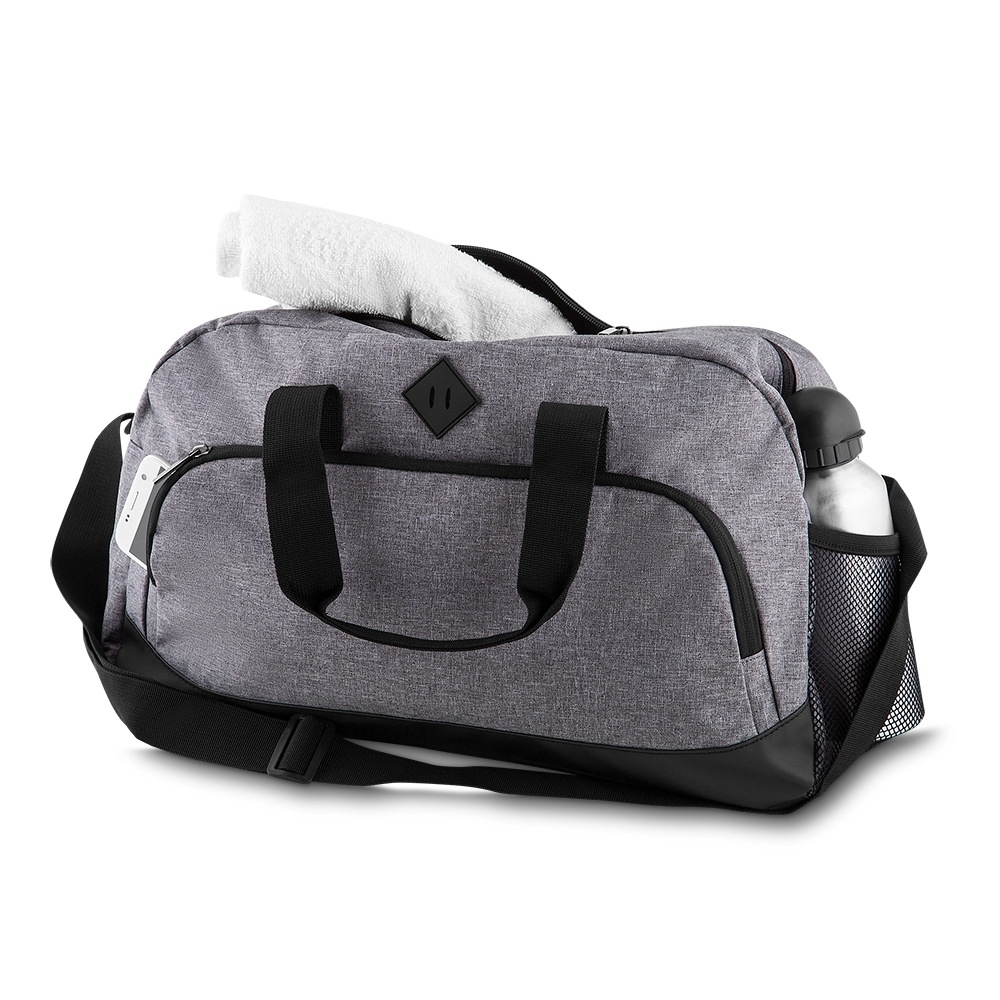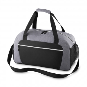Bolsa esportiva de poliéster. Possui bolso frontal, bolso lateral de malha e bolso grande superior. Alça de mão com pegador cinza de velcro e alça transversal ajustável.