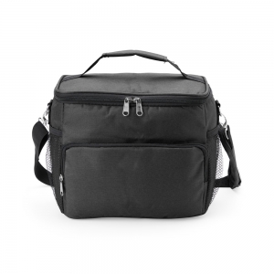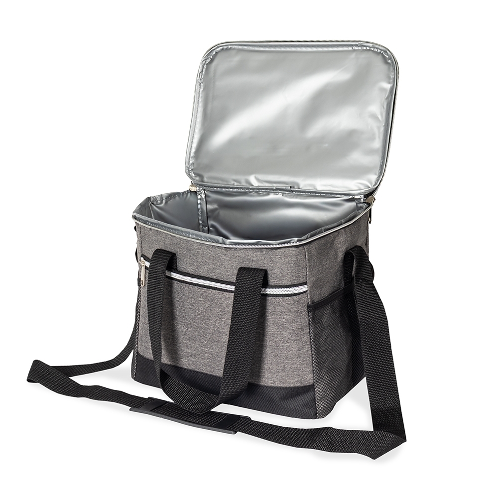 Bolsa térmica confeccionada em poliéster resistente à água e capacidade de até 15 litros. Possui revestimento interno em PEVA antivazamento, que ajuda a conservar a temperatura de alimentos e bebidas por mais tempo. Conta com bolso frontal com zíper, dois bolsos laterais em tela de nylon, alças de mão e alça transversal fixa, regulável e com apoio para ombro.