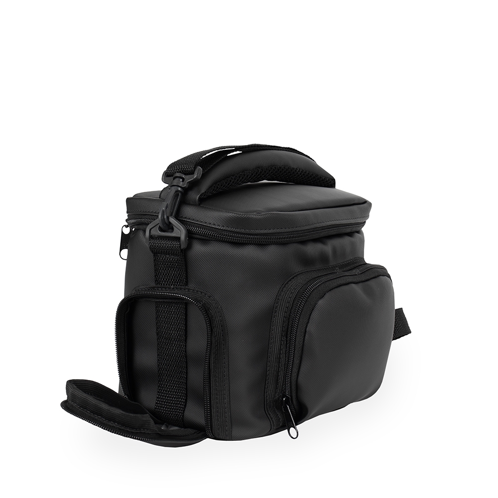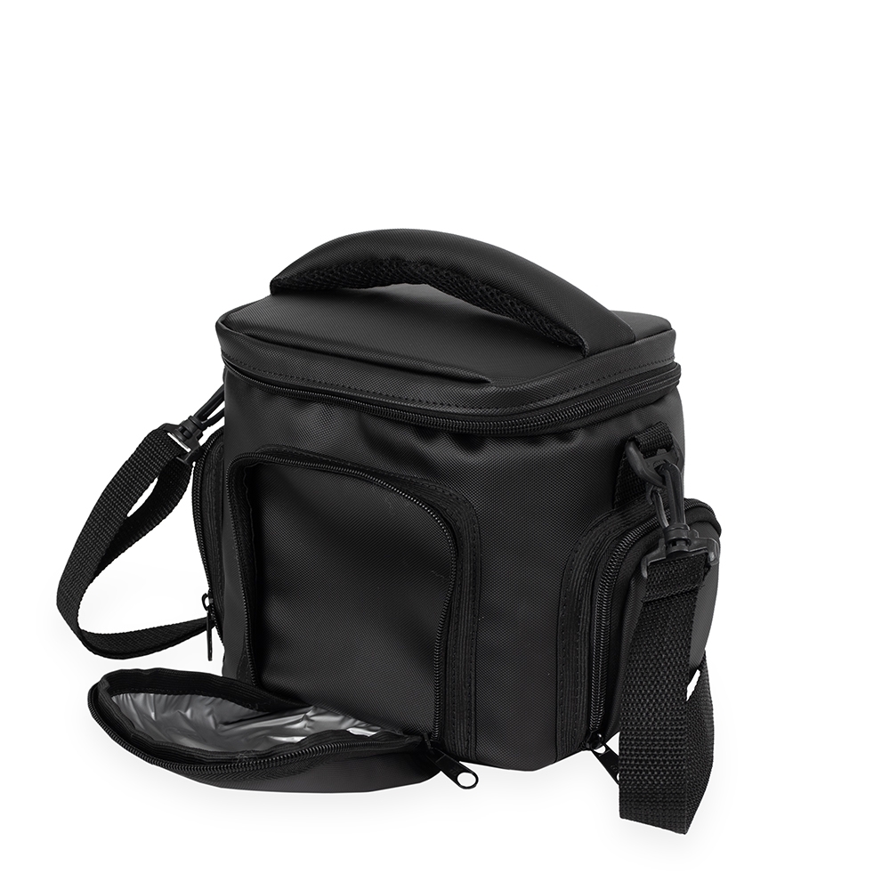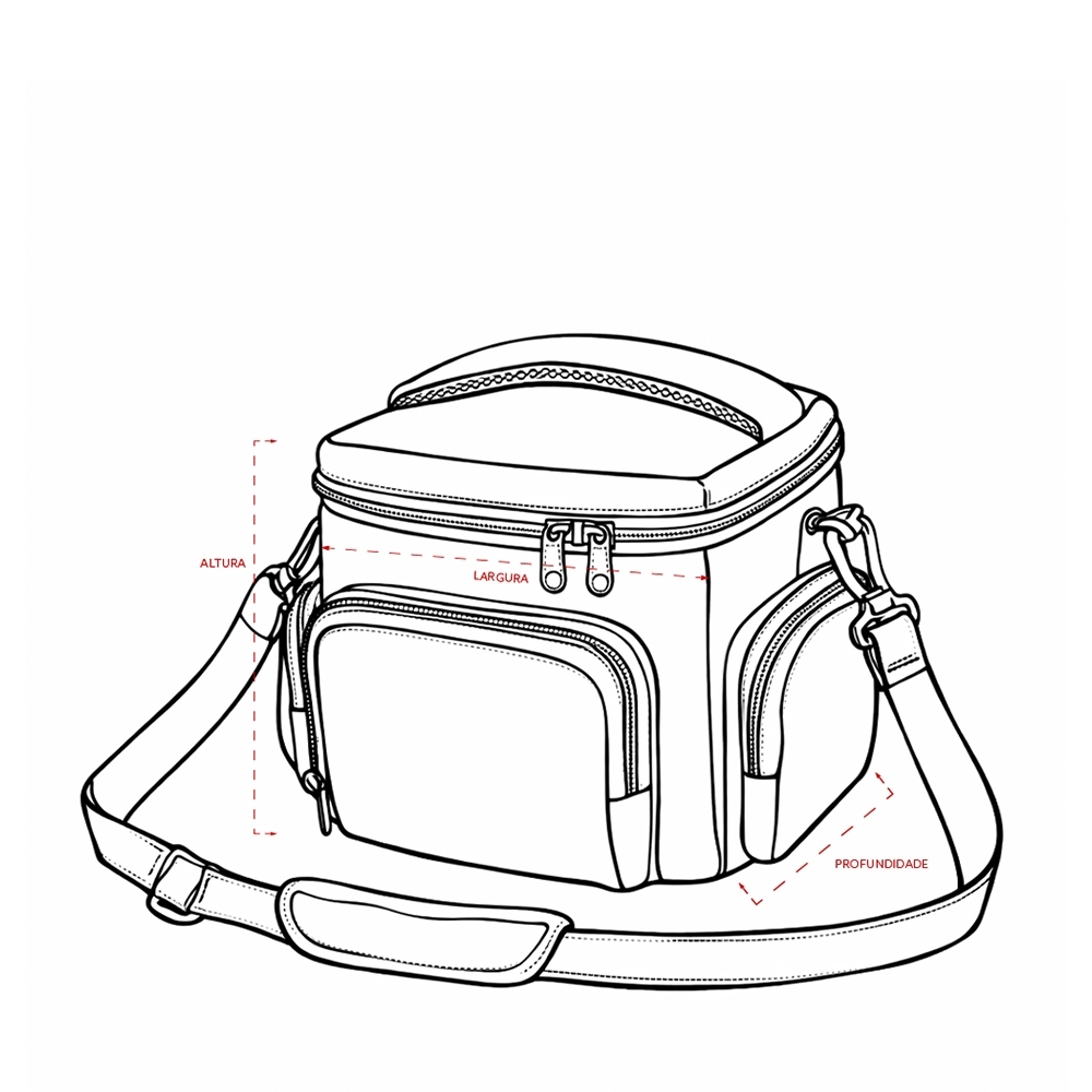 Bolsa térmica confeccionada em tecido emborrachado impermeável com fechamento em zíper e capacidade máxima de 7 litros. Possui revestimento térmico interno em espuma PAC e revestimento de folha de PVC, permitindo a conservação da temperatura de alimentos e bebidas por mais tempo. Dispõe ainda de três bolsos externos e alça de mão com revestimento em espuma. Acompanha alça transversal ajustável.
