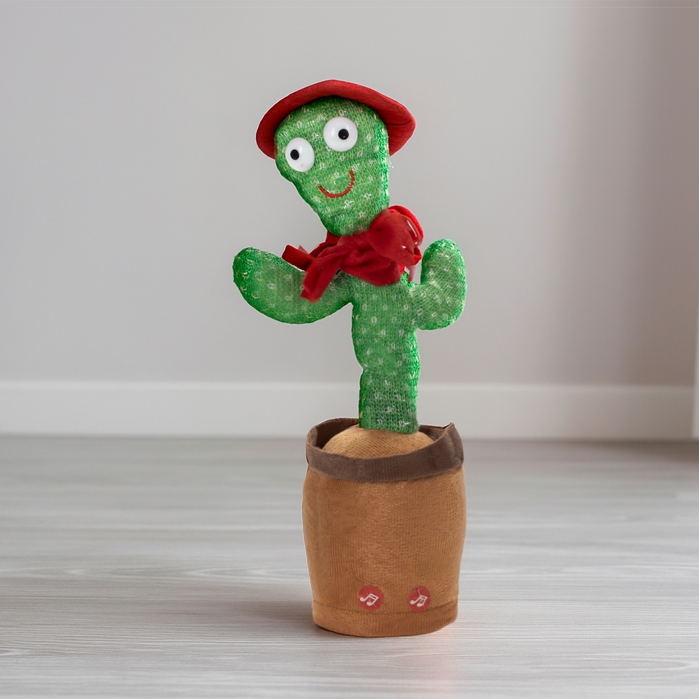 Descrição: Cacto de malha com detalhes em plástico. É um brinquedo interativo que toca músicas pré-gravadas enquanto dança e brilha, além de repetir falas e outros tipos de sons próximos. Acompanha chapéu, cachecol e cabo USB-C para carregamento.