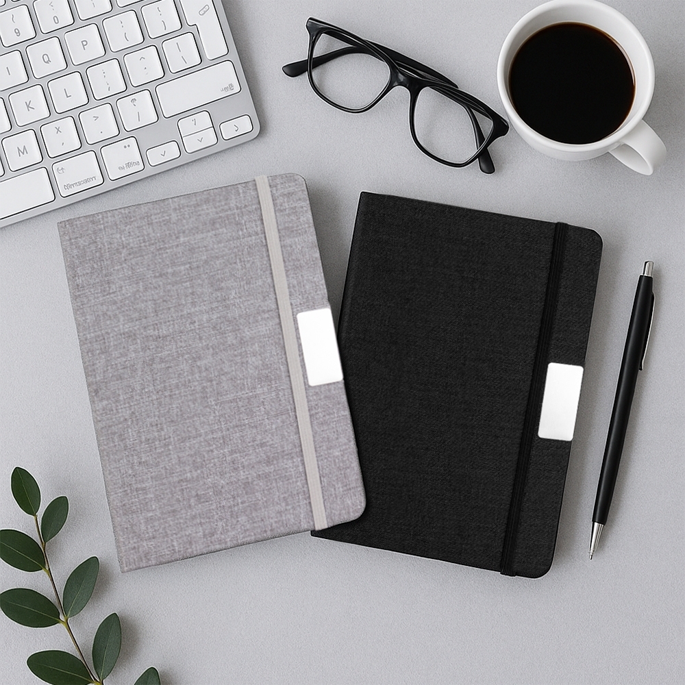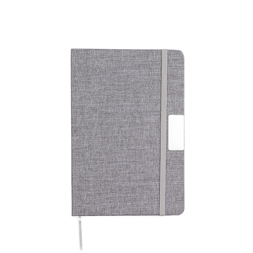 Descrição: Caderneta em capa com acabamento em tecido de algodão, plaquinha metálica personalizável, elástico para fechamento, marca-páginas em fita de cetim e aproximadamente 96 folhas marfim pautadas.