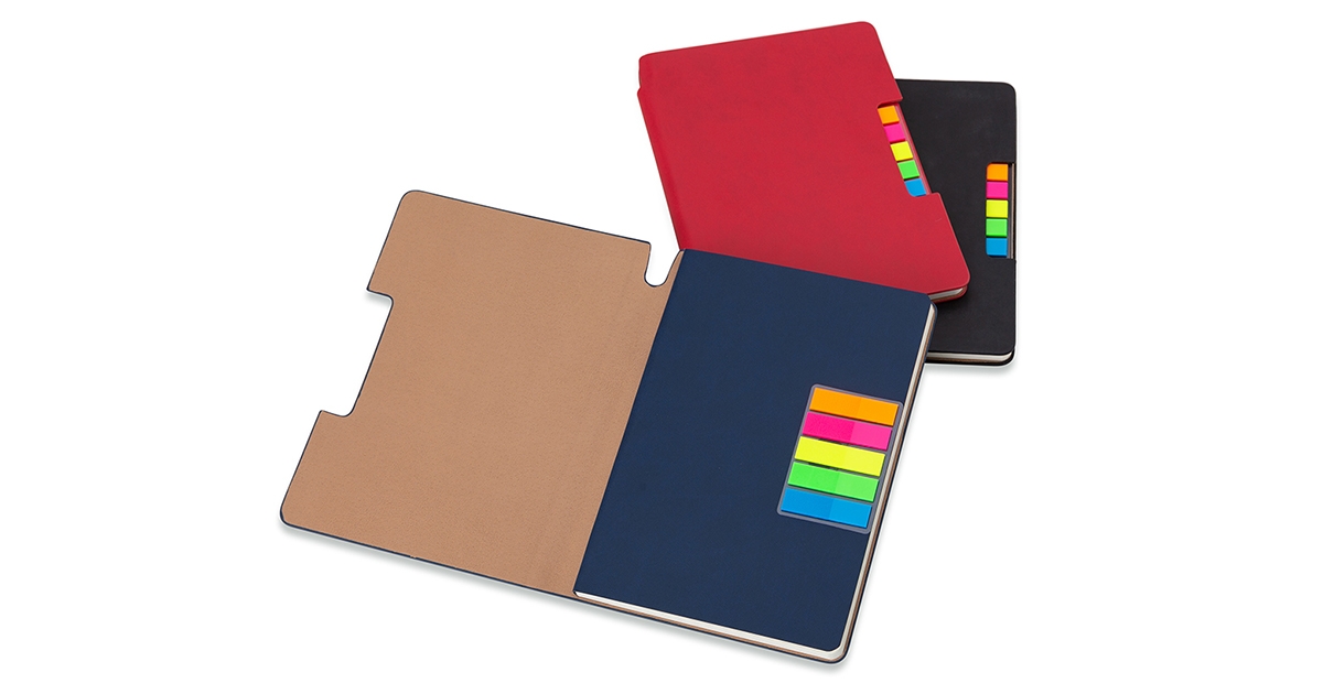 Caderneta produzida em couro sintético com autoadesivos. Capa interna com cinco bloquinhos autoadesivos coloridos com aproximadamente 25 folhas cada e bloco com aproximadamente 80 folhas pardas pautadas.