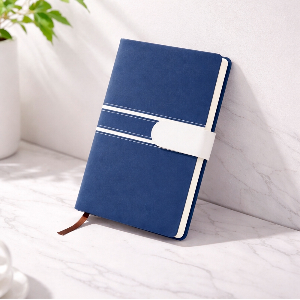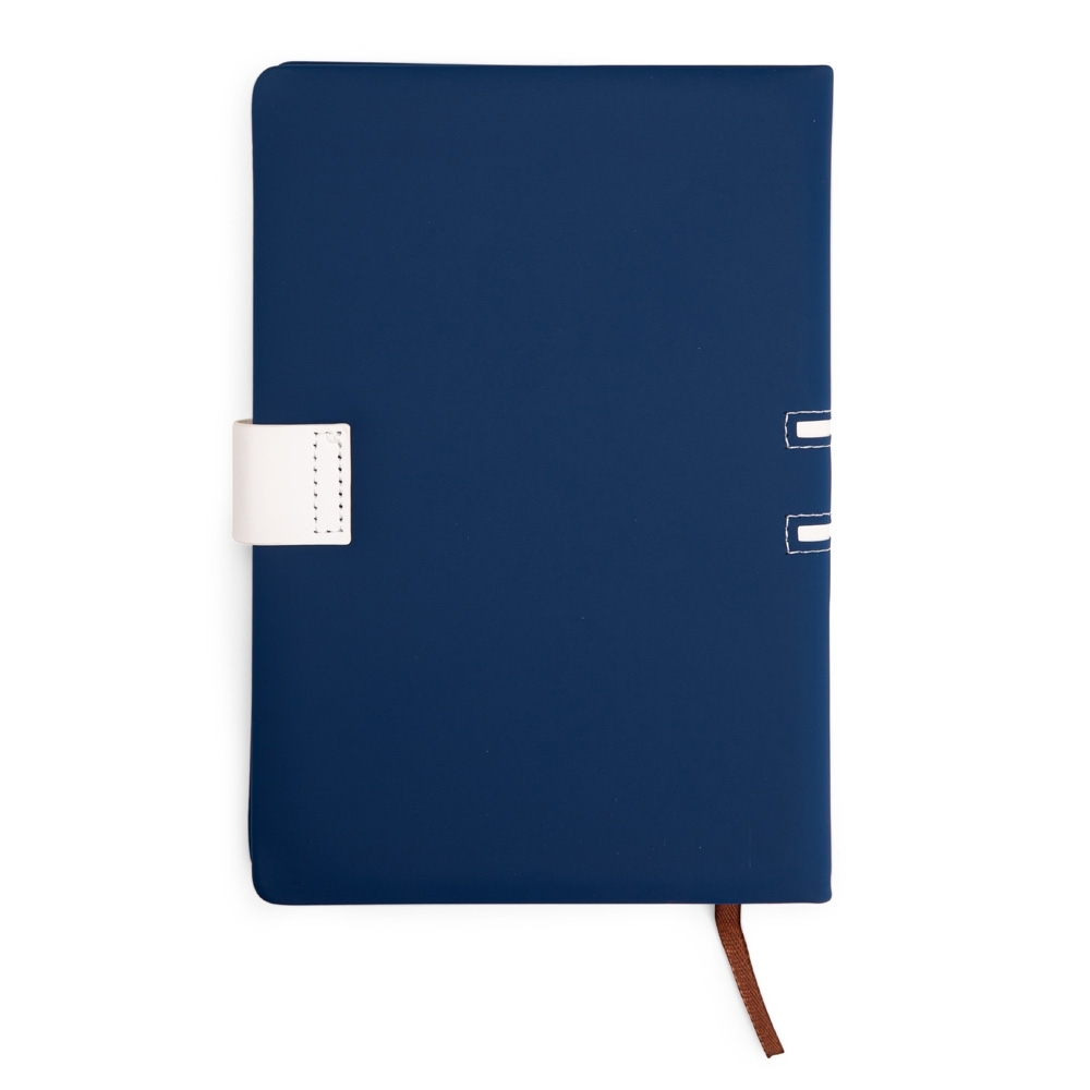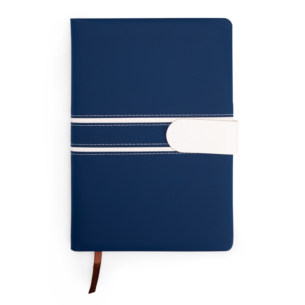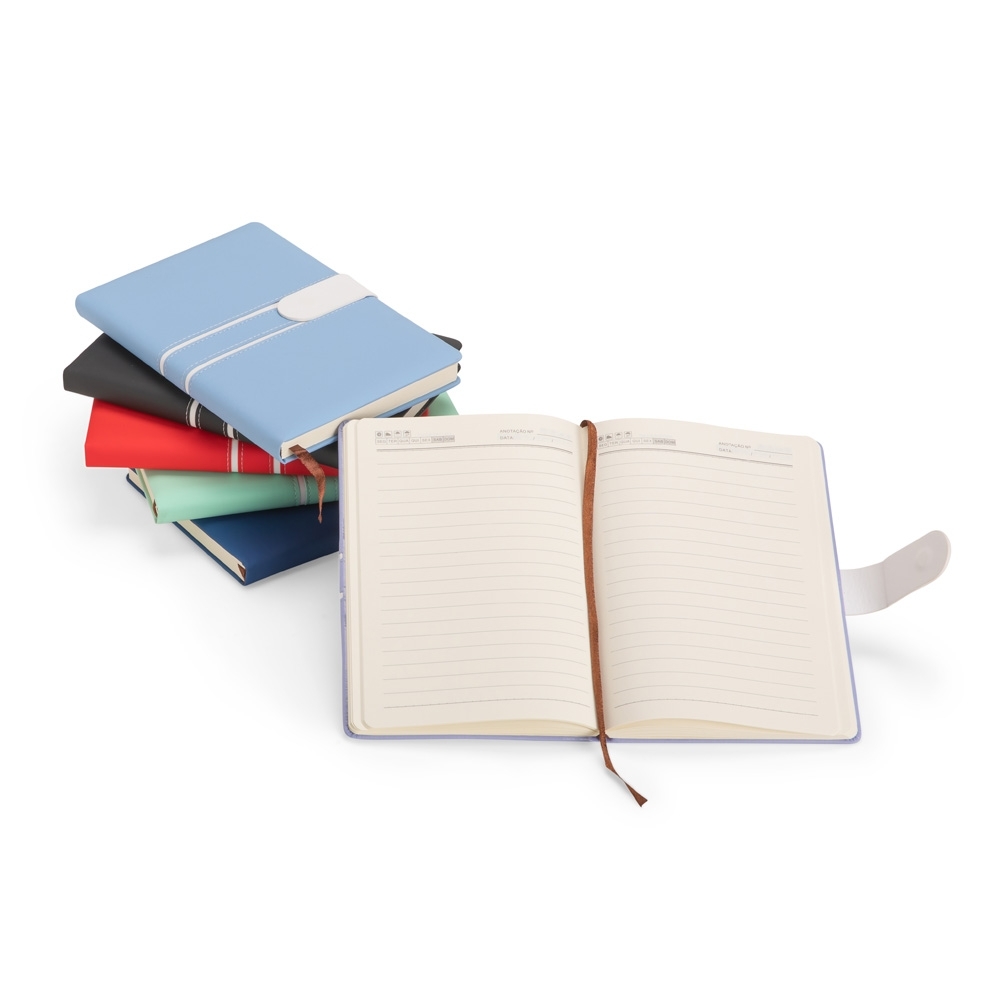 Descrição: Caderneta com capa em couro sintético, fecho magnético e marca-páginas em fita de cetim. Possui aproximadamente 112 folhas marfim com pauta.