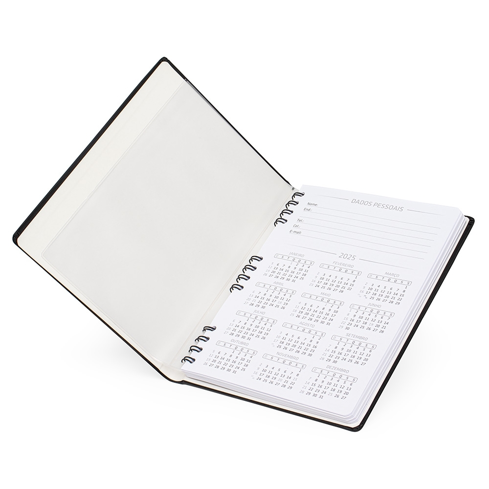 Dê vida às anotações com nossa Caderneta! Com aproximadamente 90 folhas, ela é perfeita para registrar, planejar e criar. De capa dura, feita em couro sintético e com wire-o metálico, nossa caderneta possui espaços dedicados para dados pessoais, calendários de 2025 a 2026 e planejamento, além de áreas para anotar contatos importantes: nome, e-mail e telefone. O marcador de página facilita a localização das anotações, enquanto o fechamento com elástico garante que tudo fique seguro.