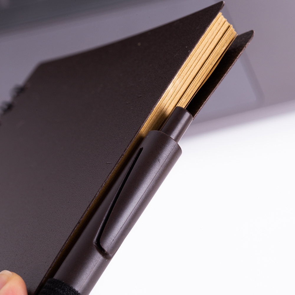 Descrição: Caderno ecológico com caneta plástica: bloco de anotações com elástico e suporte para caneta, produzido com grãos de café e polipropileno, aproximadamente 70 folhas com pauta, caneta plástica com acionamento por clique.