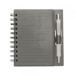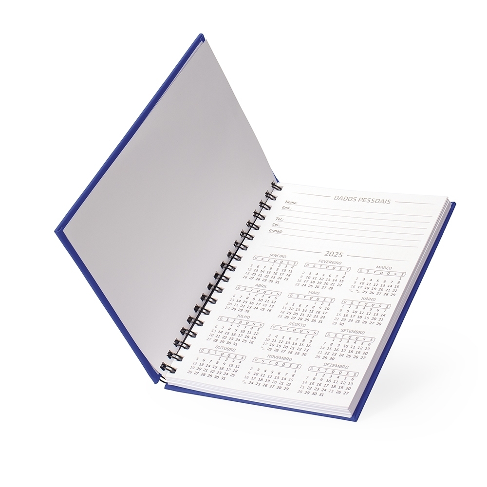 Descrição: Caderno emborrachado de frente e verso lisa com espiral preto. Possui dados pessoais, calendário de 2025 à 2027, aproximadamente 100 folhas brancas pautadas com detalhe “data” na parte superior de cada folha.