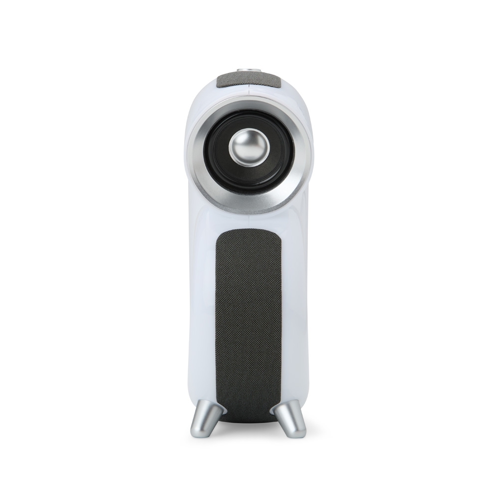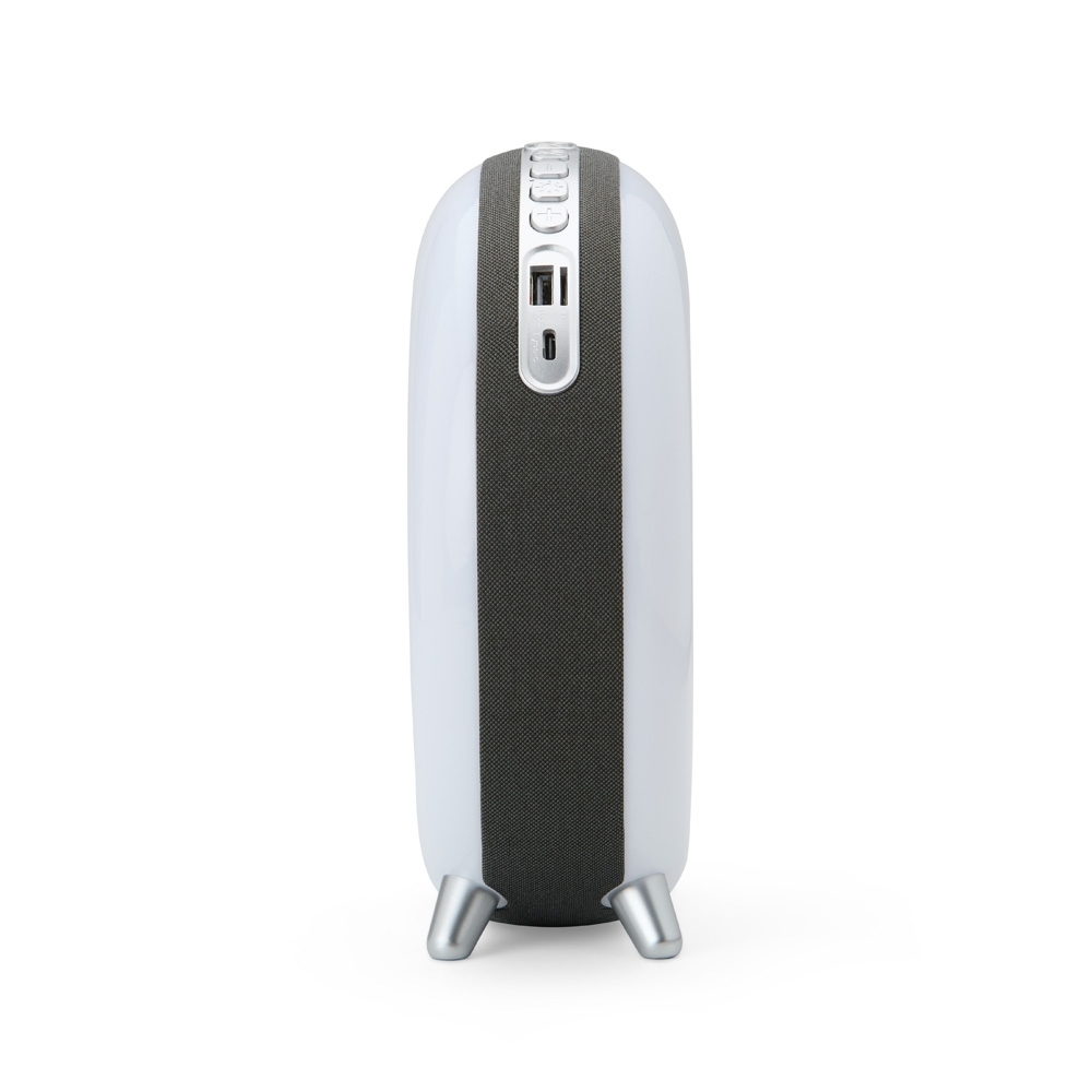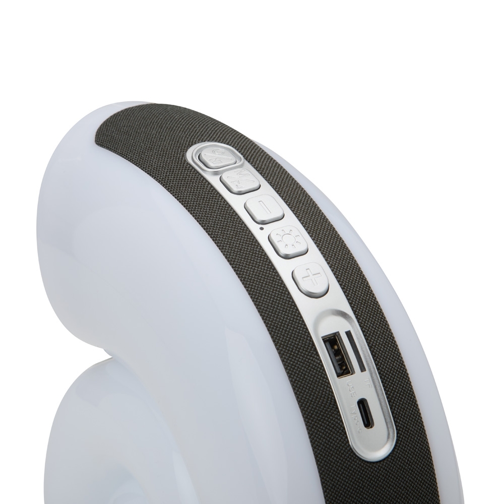 Descrição: Caixa de som multimídia em formato de concha com luminária com sete modos de iluminação RGB, além de faixa em poliéster e revestimento emborrachado antiderrapante nos pés. Possui conexão Bluetooth, rádio FM e compatibilidade com a tecnologia TWS. Dispõe ainda de painel de botões para controlar a reprodução de músicas a partir de aparelhos pareados, pen drives ou cartões microSD, por meio das entradas USB-A e TF. Acompanha Cabo USB-C para carregamento.
