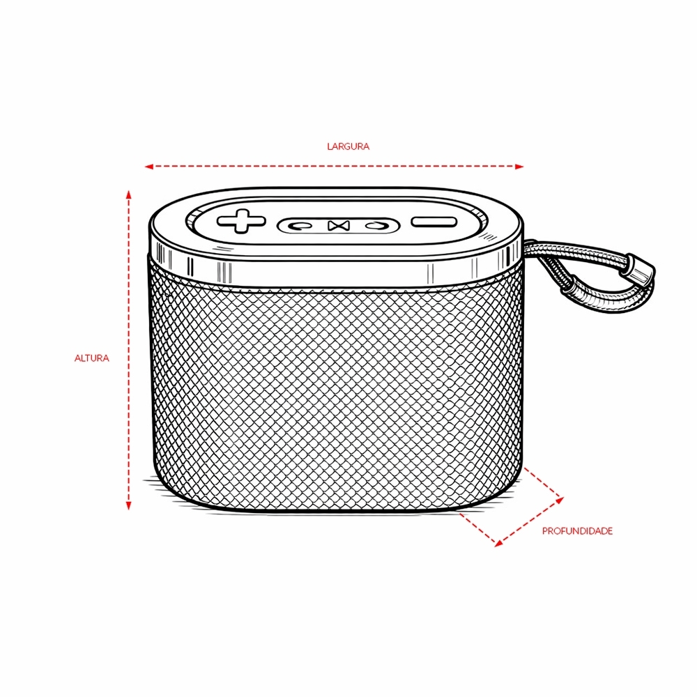 Caixa de som multimídia com estrutura em plástico ABS, revestimento em poliéster, painel de botões em silicone, iluminação RGB ajustável, base com pés antiderrapantes e alça em nylon com protetor em silicone. Possui conexões Bluetooth 5.3, rádio FM e TWS para sincronizar duas caixas de som ao mesmo tempo. Conta com entradas USB-C para recarga do aparelho e auxiliar (P2) para dispositivos compatíveis, além de portas USB-A e TF para reprodução de arquivos MP3 via pen drives e cartões microSD. Acompanha cabo USB.