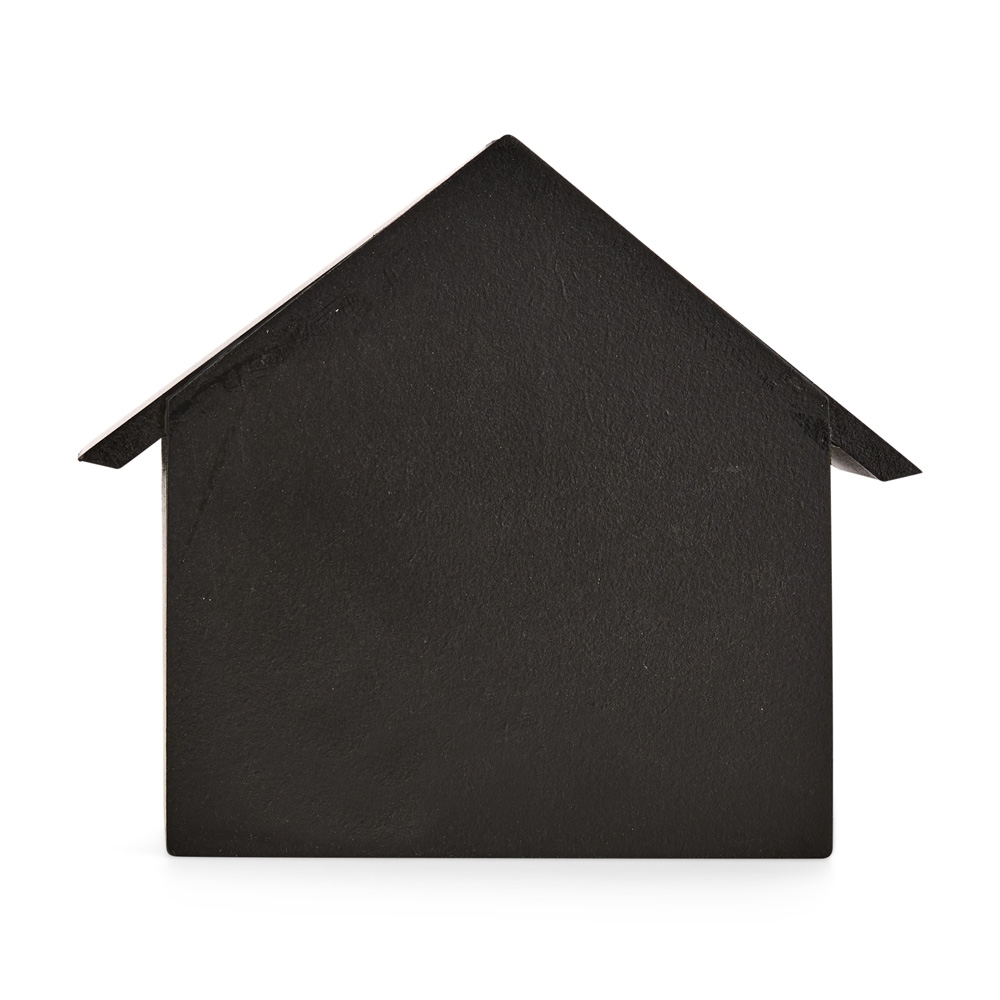 Calendário de mesa permanente em madeira com formato de uma casa. De uso intuitivo, conta com dois cubos para os dias do mês em formato numérico e três blocos com os nomes dos meses para atualização manual de data.