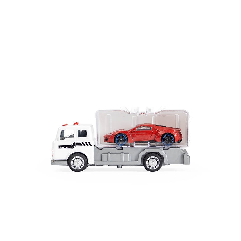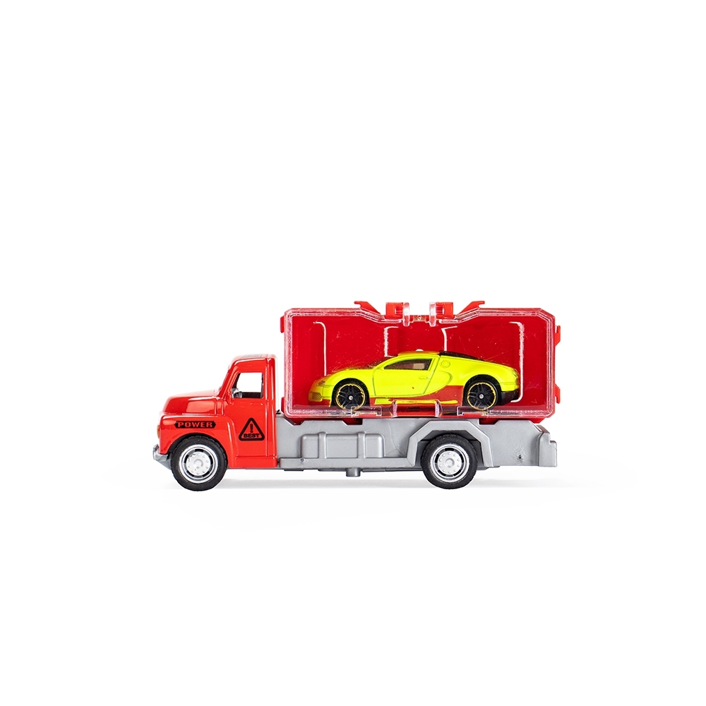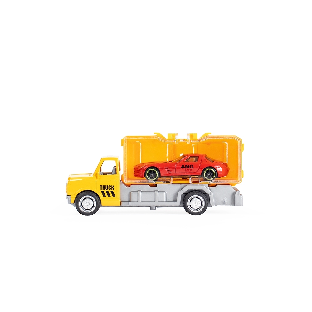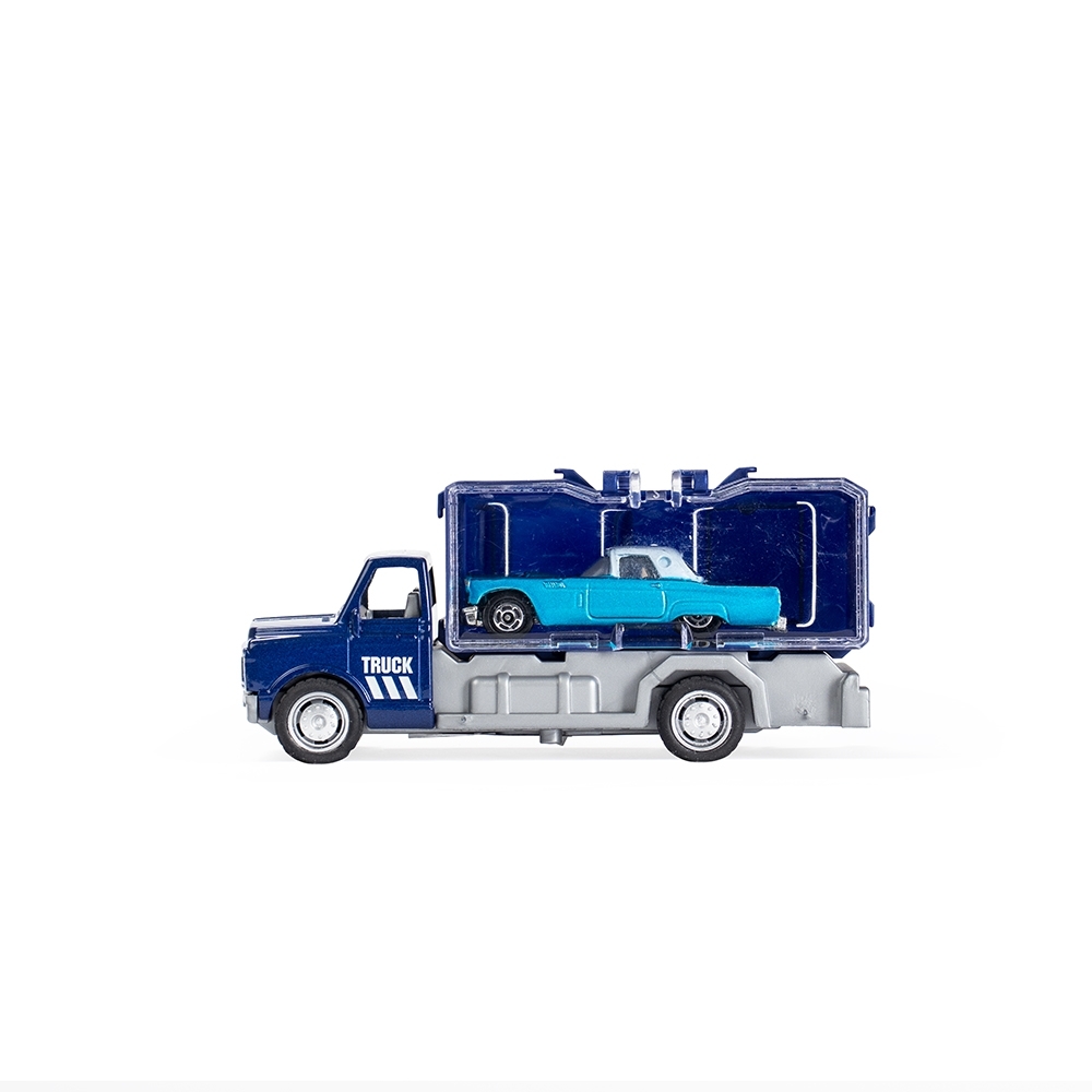 Caminhão em miniatura com estrutura em plástico e metal. Possui baú encaixável com abertura funcional e espaço para guardar o carro em miniatura, feito em metal plástico, que acompanha o caminhão.