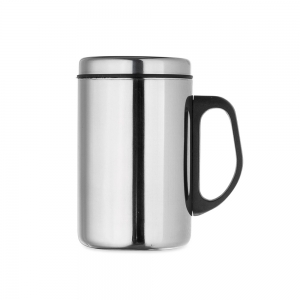 Caneca de inox 180ml com cabo e tampa em plástico resistente (não é térmica).