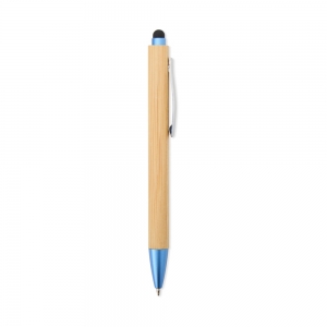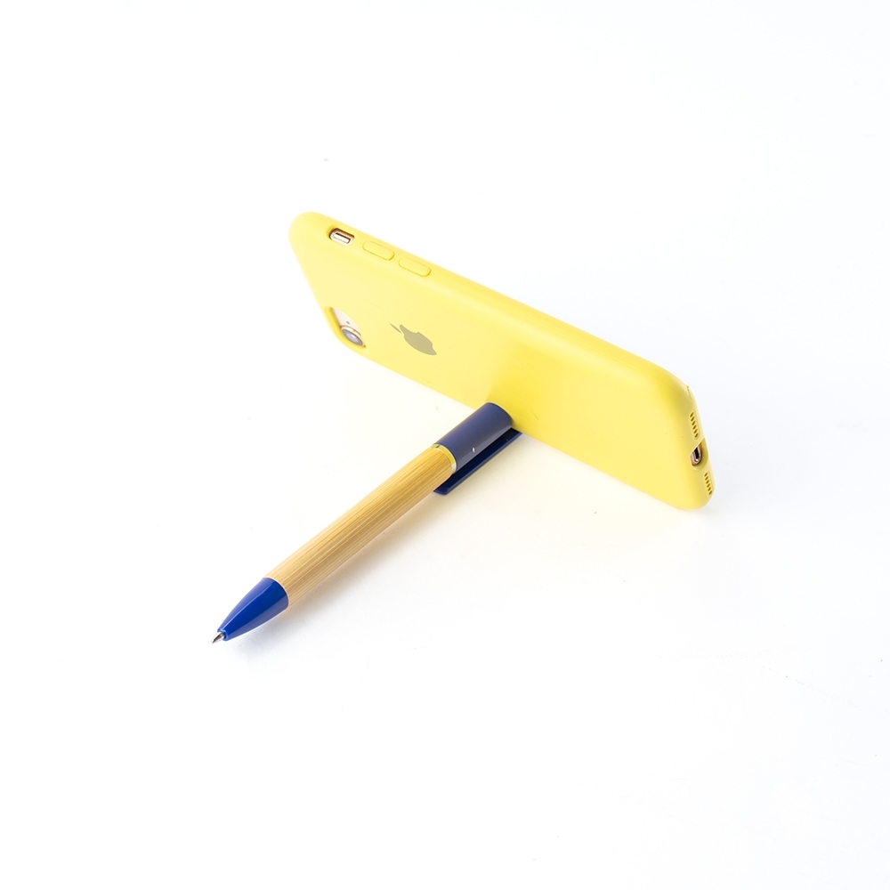 Caneta em bambu com ponta e ponteira com suporte para celular em plástico, acionamento por rotação e carga esferográfica azul de 1.0mm.
