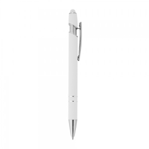Descrição: Caneta touch screen metálica com acabamento inteiramente emborrachado, carga esferográfica preta e acionamento por clique.