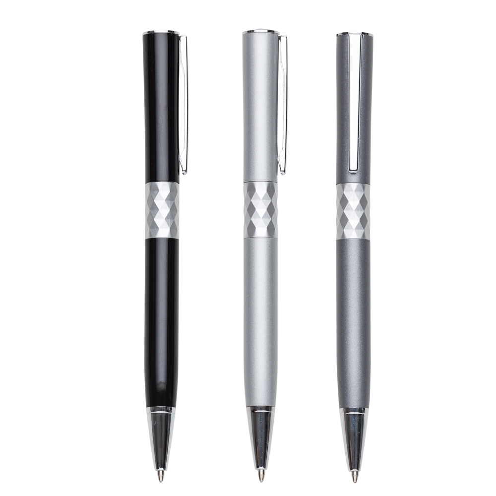 Descrição: Caneta metálica com carga esferográfica azul e acionamento por rotação. OBS.: PEDIDO APENAS MÚLTIPLO DE 50 PEÇAS!
