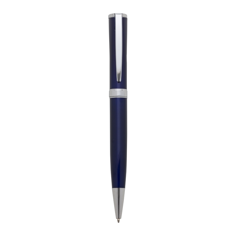 Descrição: Caneta metálica com carga esferográfica azul 1.0 mm e acionamento por rotação.