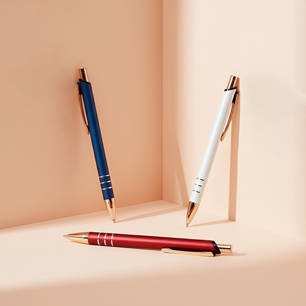 Descrição: Caneta metálica com acionamento por clique e carga esferográfica azul de 1,0mm, oferecendo uma pegada leve para uma escrita mais precisa.