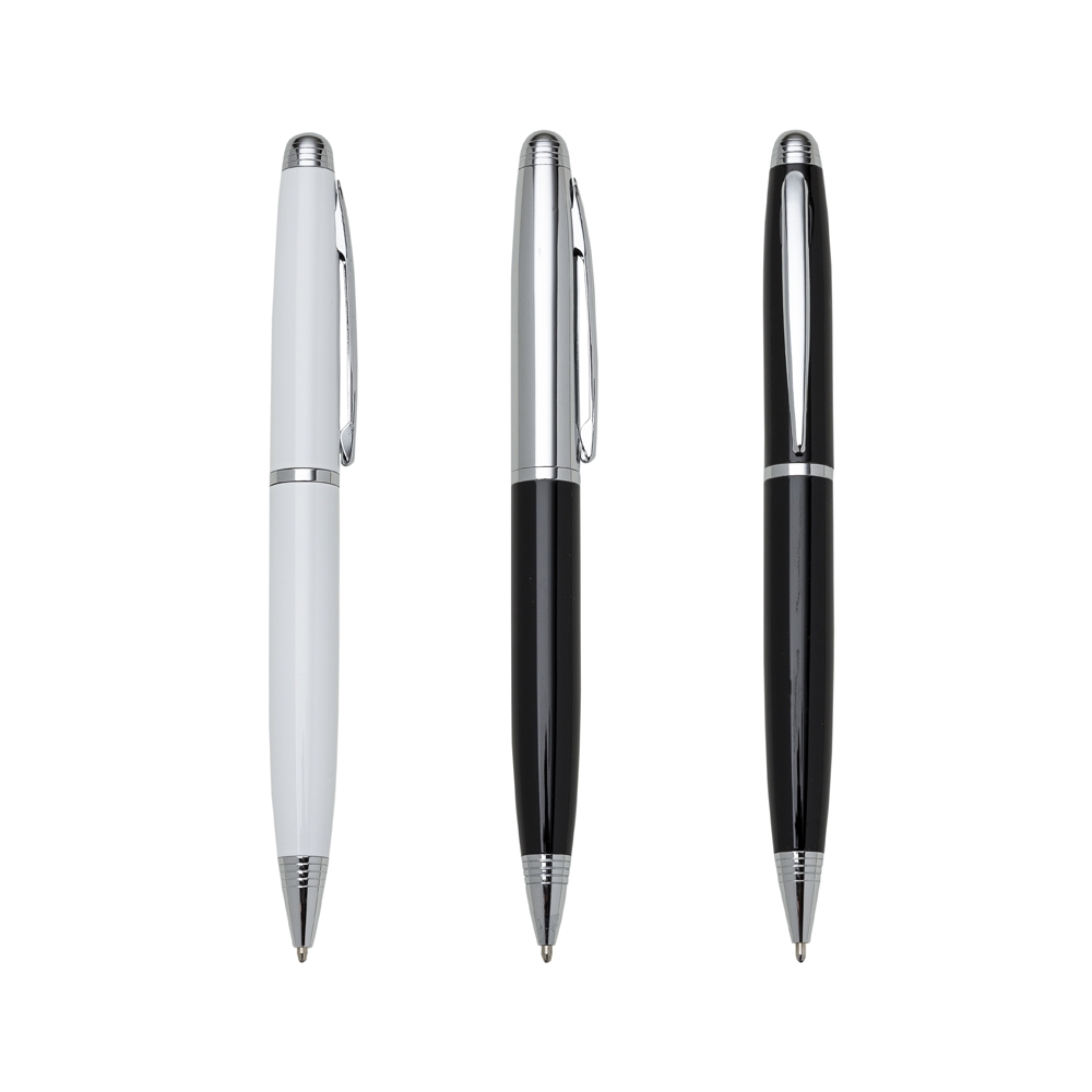 Descrição: Caneta metálica com carga esferográfica azul e acionamento por rotação.