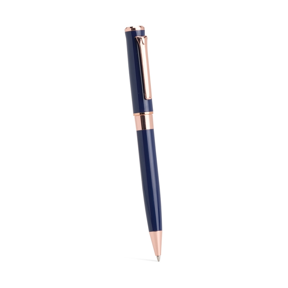 Caneta esferográfica de carga azul de 1.0mm com acionamento por rotação e construção totalmente em metal, que proporciona uma pegada confortável para uma escrita mais precisa.