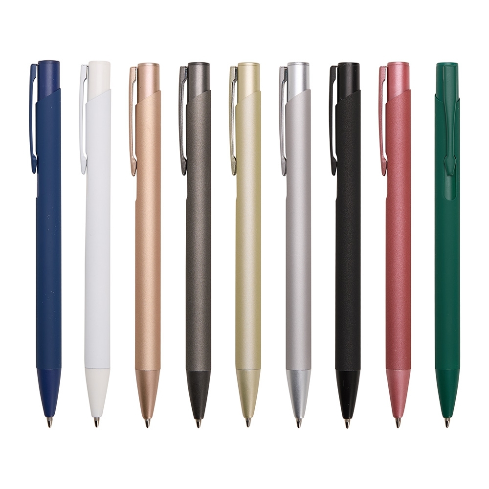 Caneta metálica com ponta e clip em plástico. Possui acionamento por clique e carga esferográfica azul de 1.0mm.