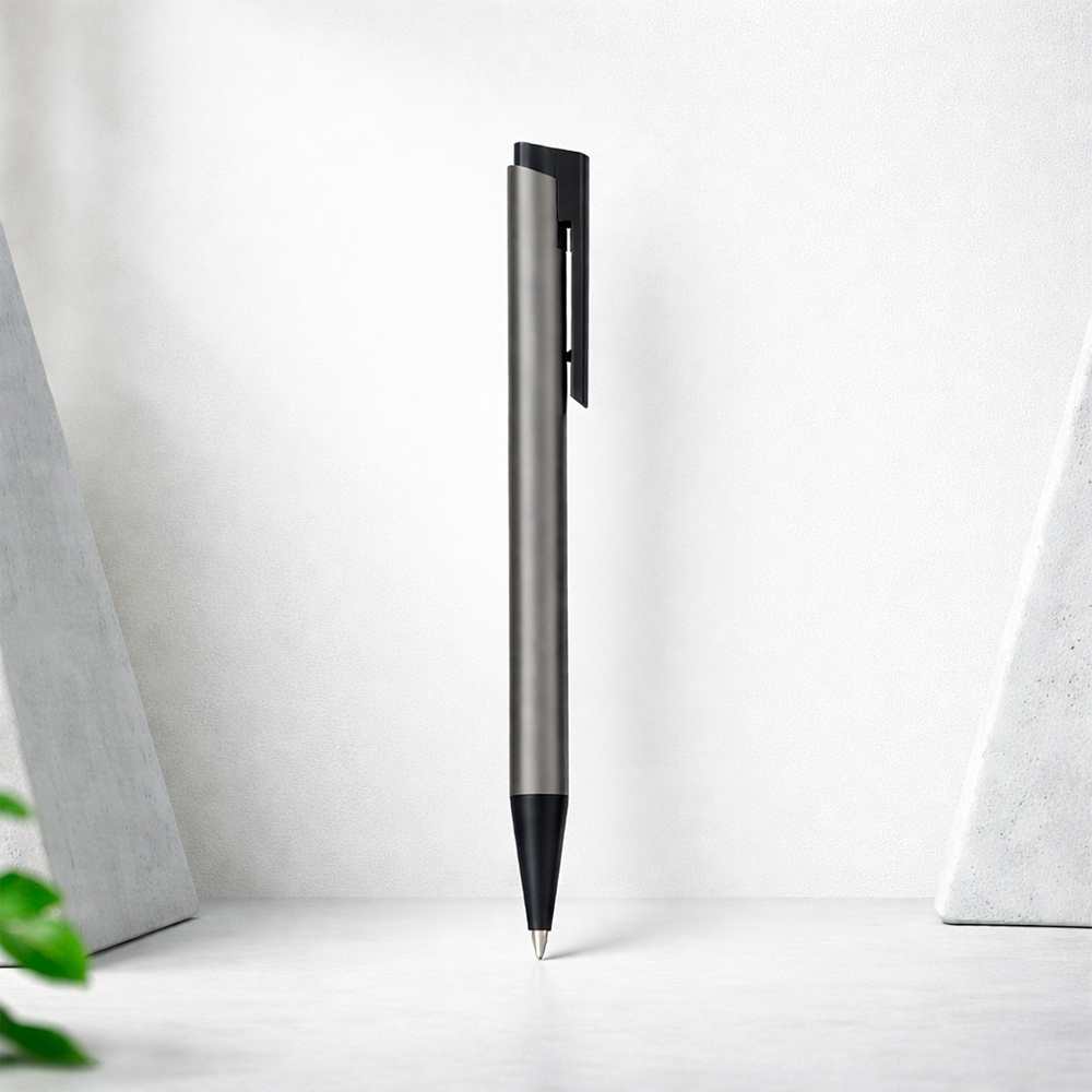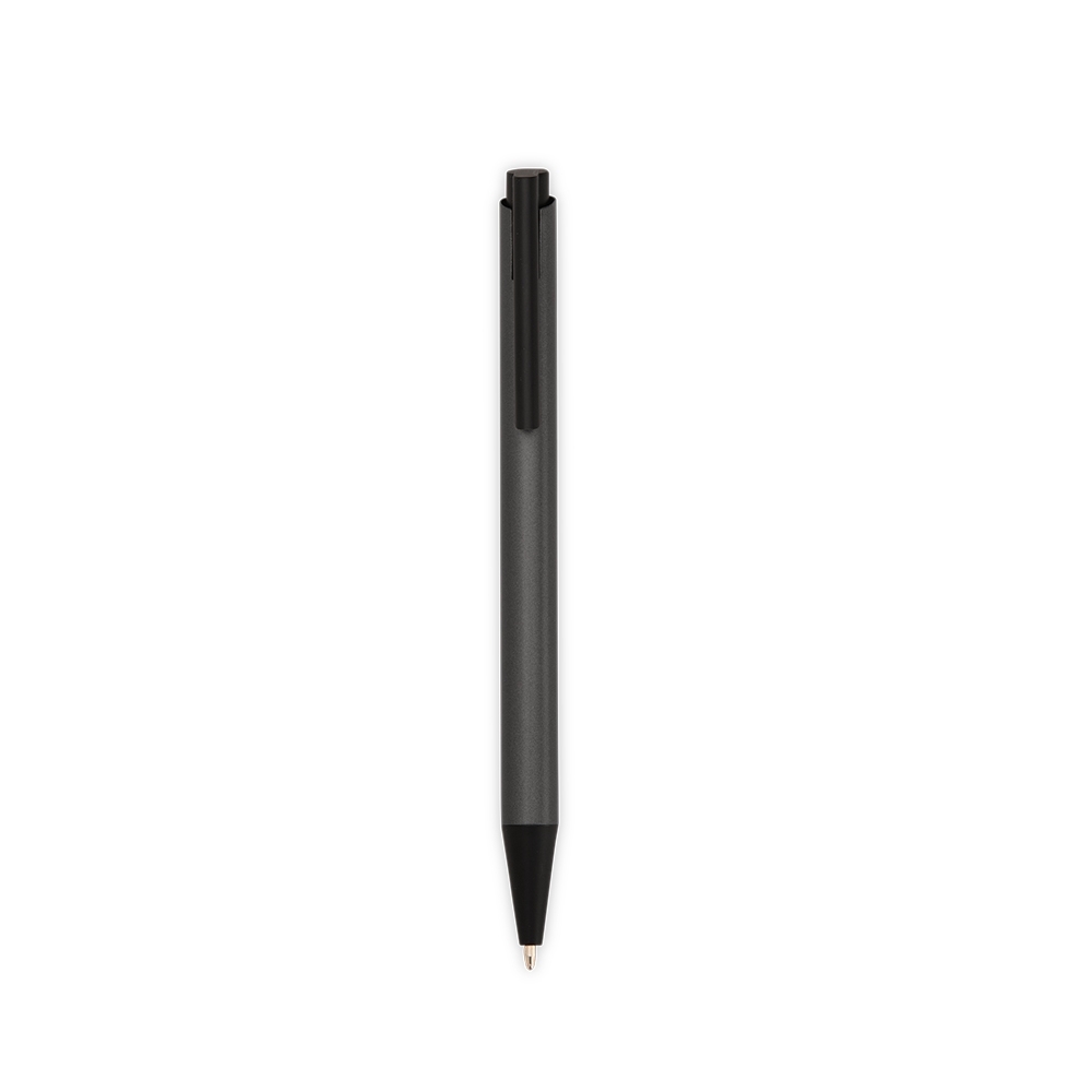 Descrição: Caneta metálica com ponteira, clip e acionamento em plástico. Possui carga esferográfica azul de 1,0mm e acionamento por clique.