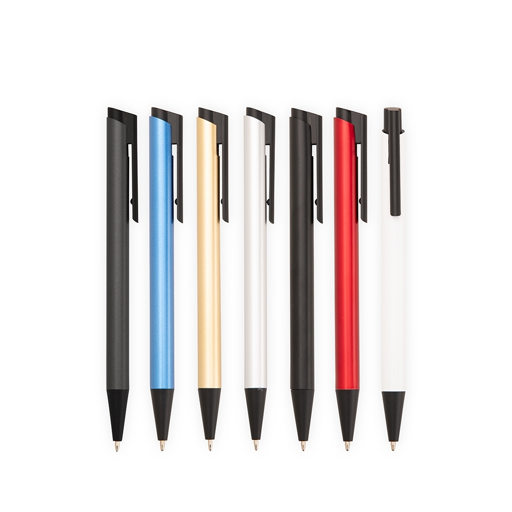 Caneta metálica com ponteira, clip e acionamento em plástico. Possui carga esferográfica azul de 1,0mm e acionamento por clique.