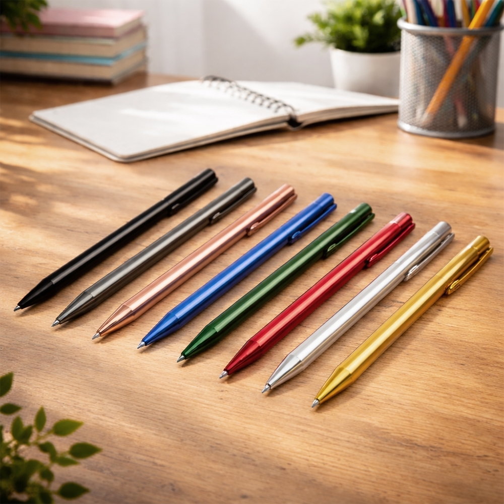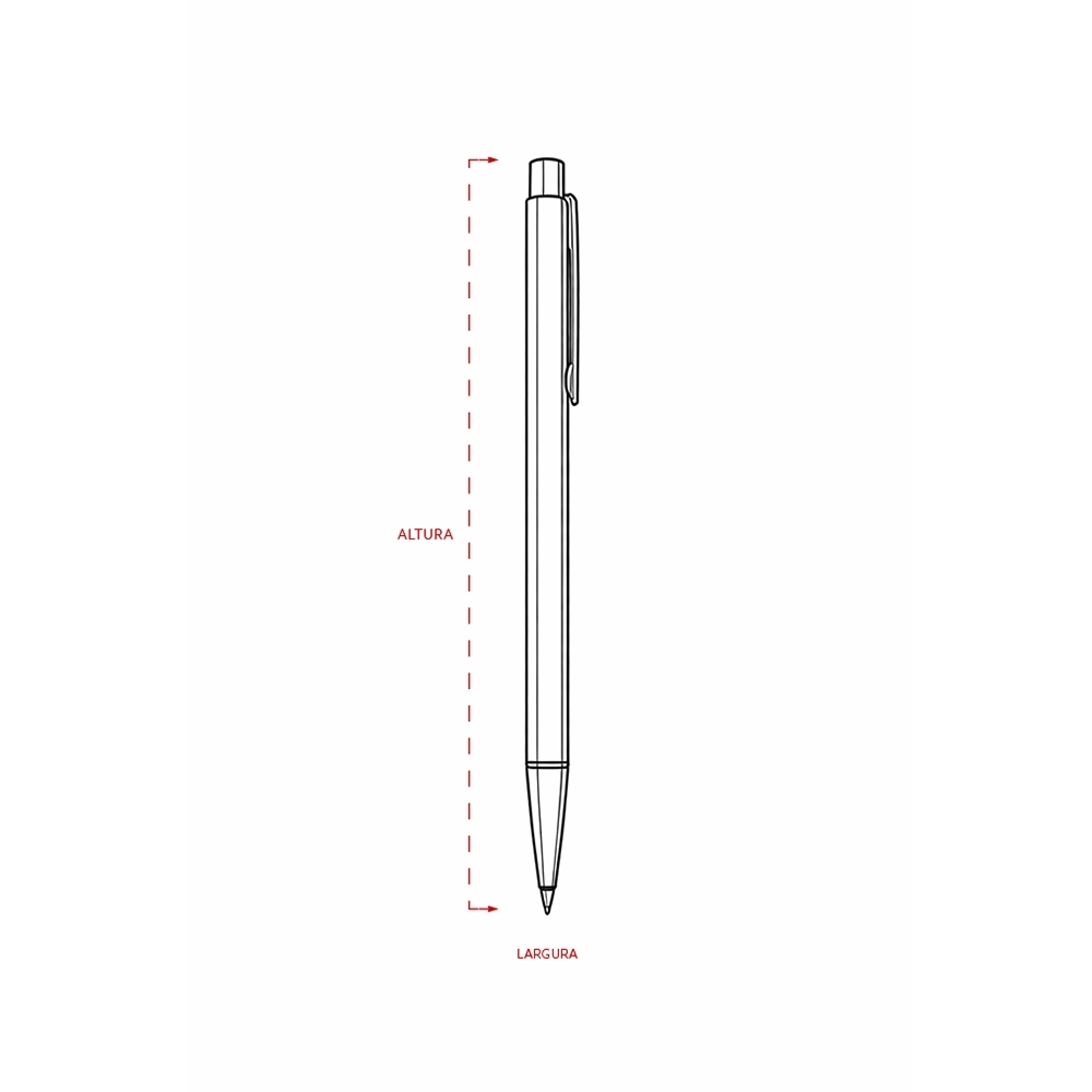 Descrição: Caneta metálica com acabamento brilhante, acionamento por clique e carga esferográfica azul de 1,0mm.