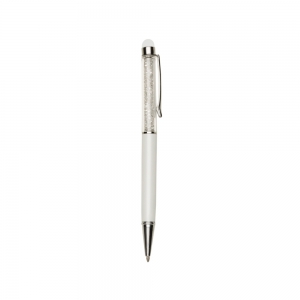 Caneta plástica com carga esferográfica azul e acionamento por clique.