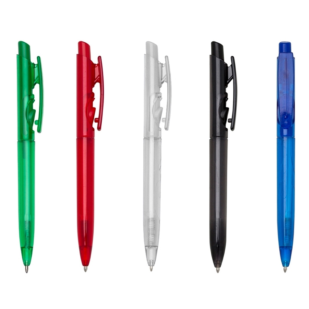 Descrição: Caneta plástica com carga esferográfica preta 1.0mm e acionamento por clique.