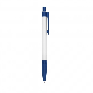Caneta plástica com carga esferográfica azul e acionamento por clique.