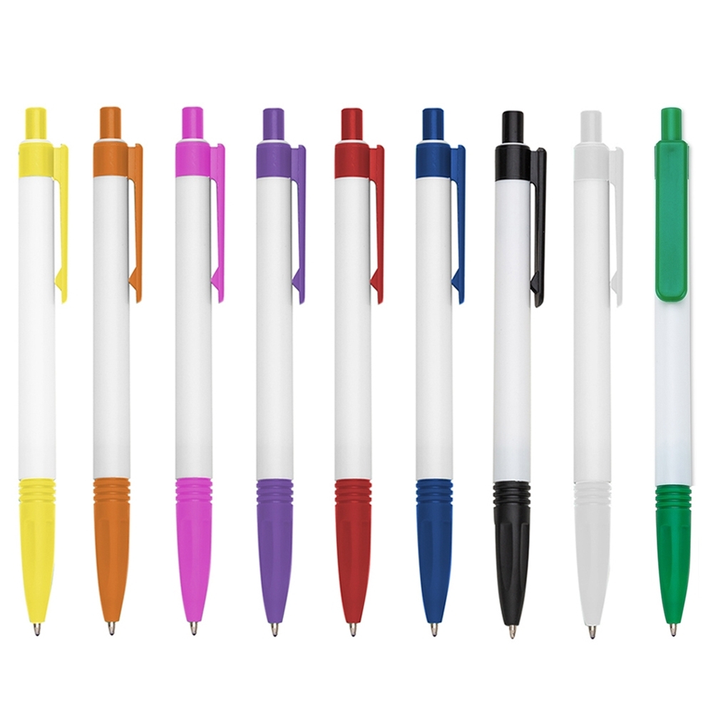 Descrição: Caneta plástica com carga esferográfica azul 1.0 e acionamento por clique.