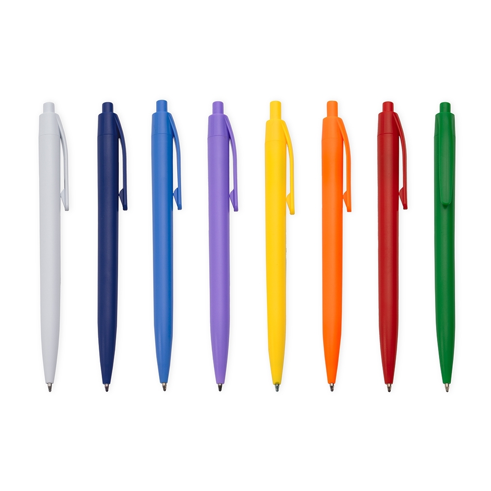 Caneta feita inteiramente em plástico. Conta com acionamento em por clique e carga esferográfica azul de 1.0mm.