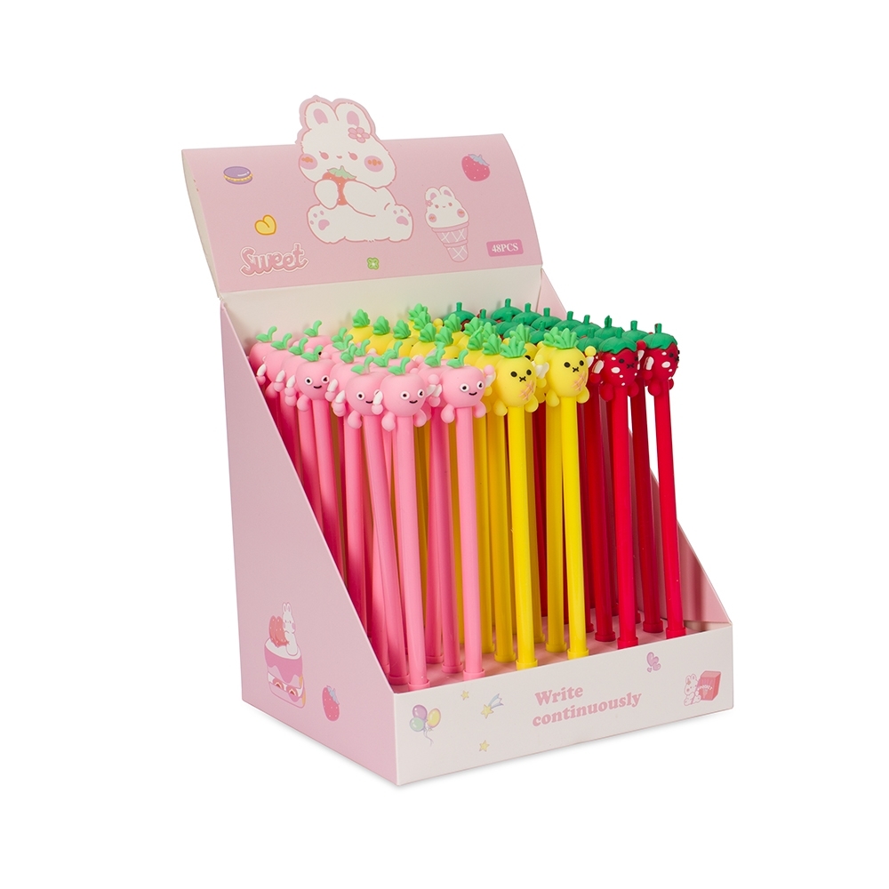Caneta esferográfica mista com enfeite em formato de uma fruta estilizada. Feita em plástico, possui tinta em gel e carga azul de 0.5mm, garantindo um toque leve para uma escrita suave e precisa.