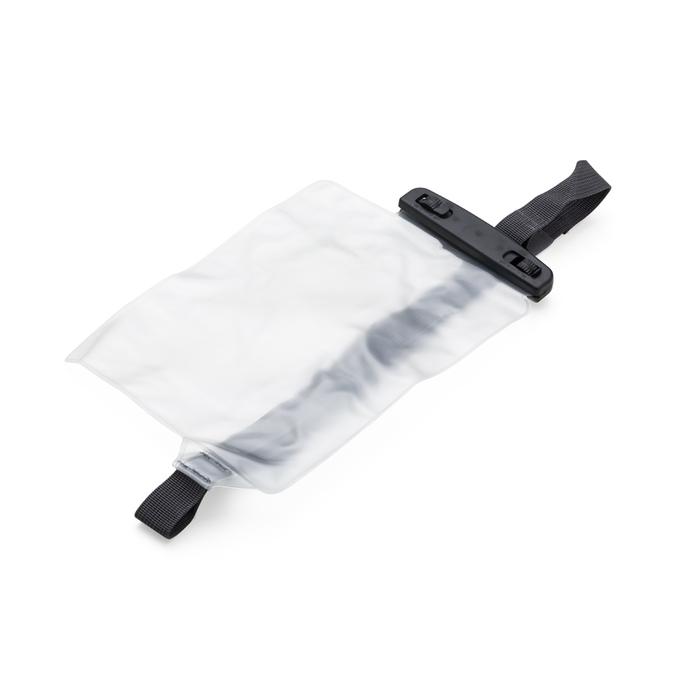 Capa impermeável para itens diversos. Parte frontal transparente e verso fosco, suporte plástico preto com fivelas rotatórias(basta rotacioná-las para abrir o case). Possui alça de nylon ajustável com fivela plástica.