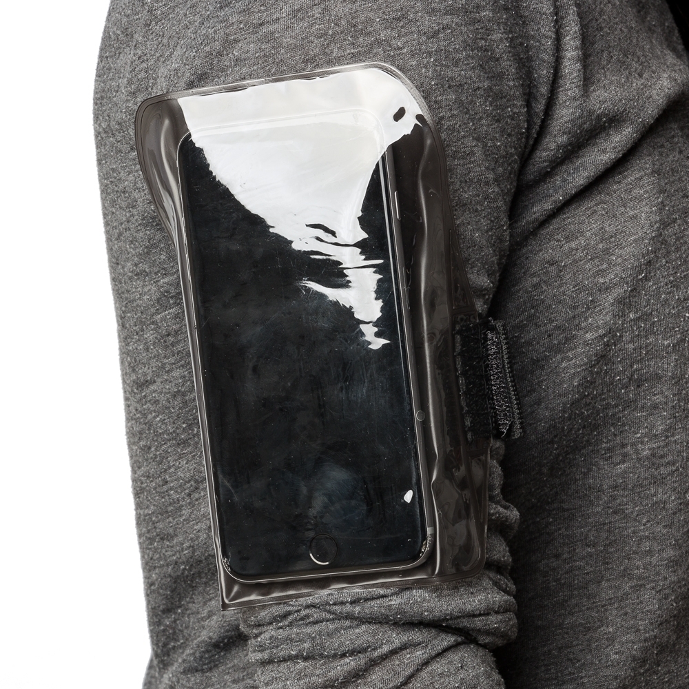 Capa braçadeira impermeável para celular. Parte frontal transparente e verso fosco, suporte plástico superior com fivelas rotatórias(basta rotacioná-las para abrir o case). Possui na lateral fita elástica com velcro para e acompanha cordão de cetim.