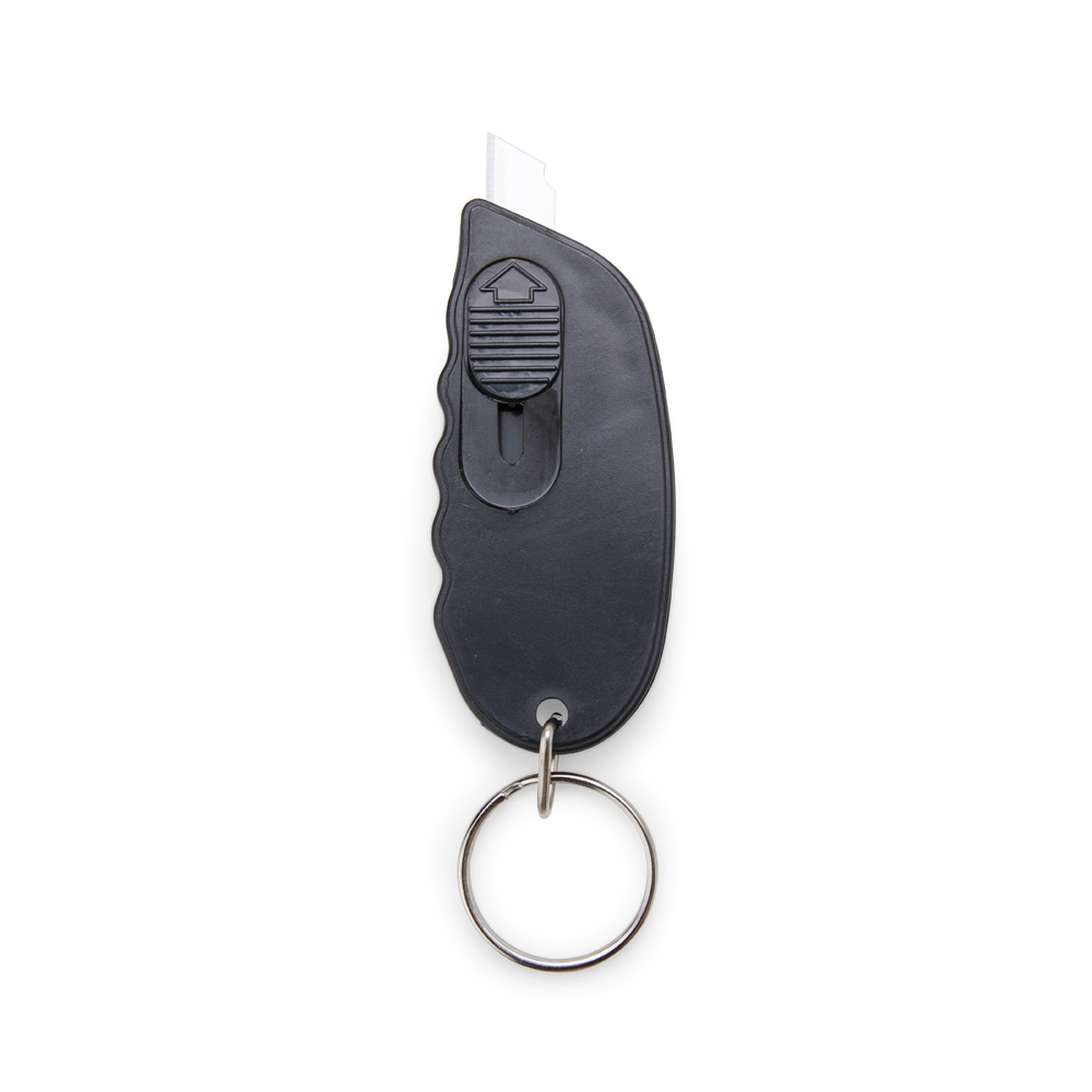 Descrição: Chaveiro estilete projetado em plástico com sistema de retração automática para maior segurança. Após o uso, basta soltar o botão e a lâmina retorna automaticamente à posição de armazenamento, minimizando o risco de acidentes.