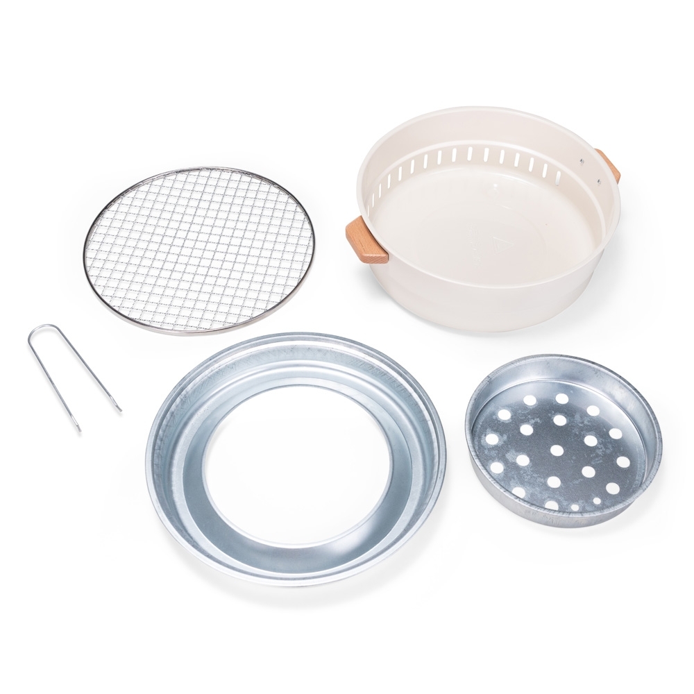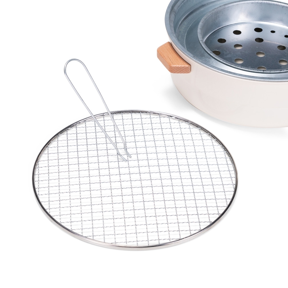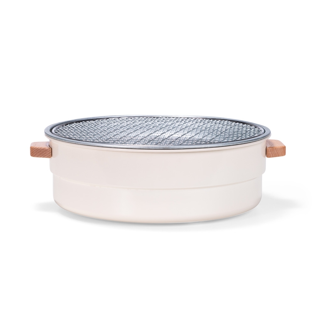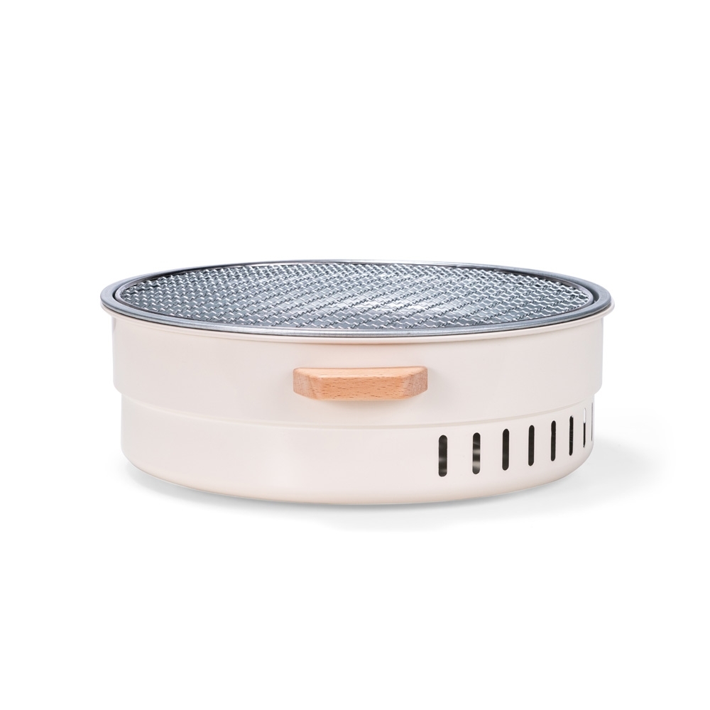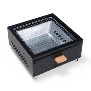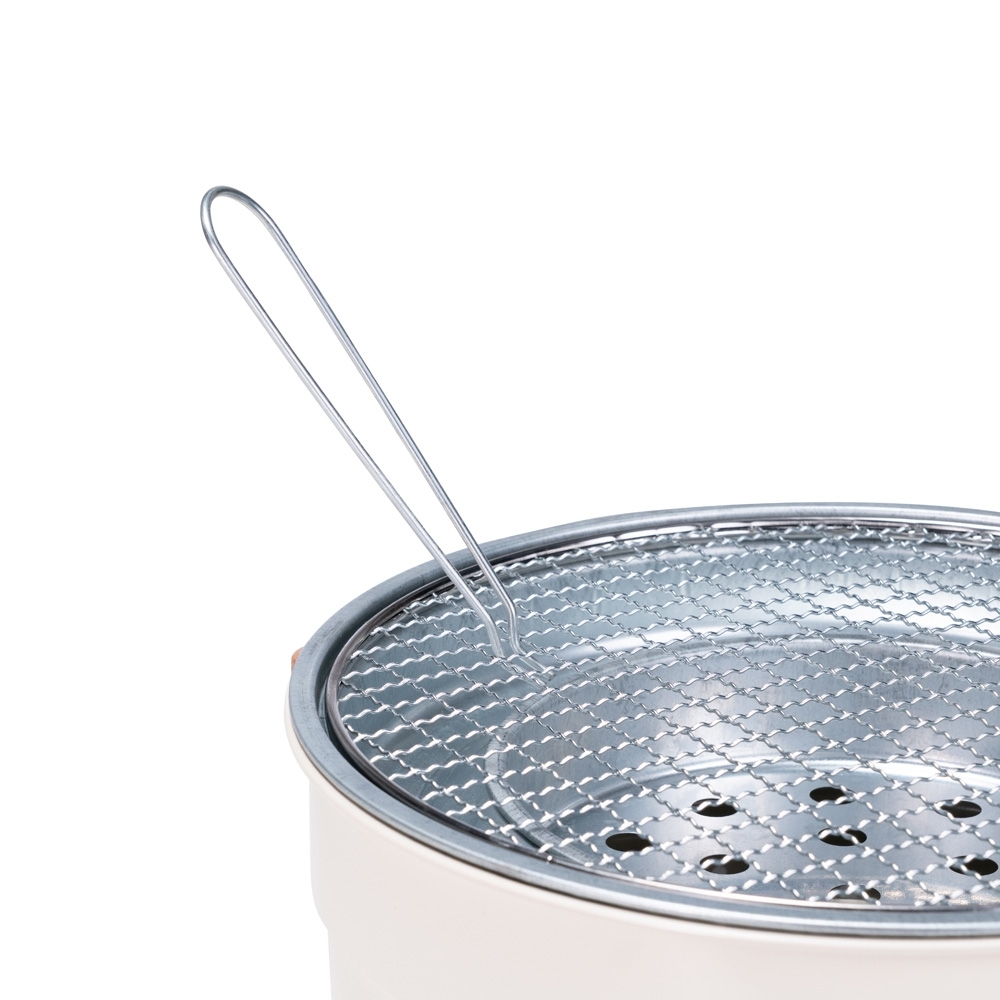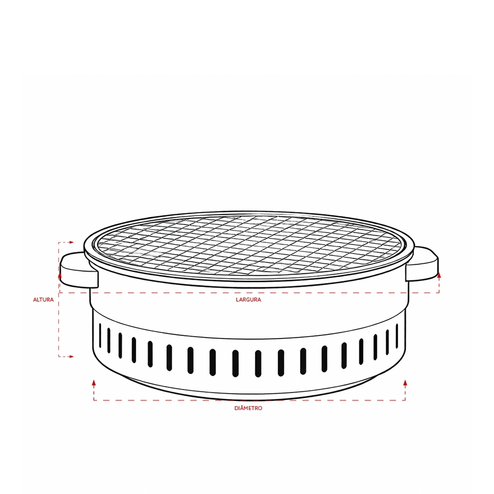 Churrasqueira portátil em ferro com alças laterais em madeira. Conta com grelha e bandejas para carvão em metal. Acompanha parafusos e chave Allen com ponta Phillips para fixação das alças.