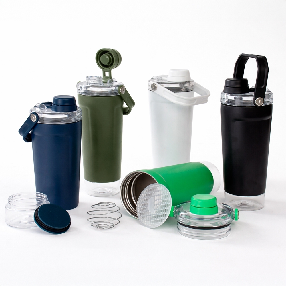 Coqueteleira térmica de parede dupla, com parte externa em inox 201 e pintura eletrostática, e camada interna em inox 304. Com capacidade máxima de 650ml, possui tampa rosqueável em polipropileno (PP) e policarbonato (PC), com protetor para o bocal e alça para transporte. Apresenta fundo rosqueável em PET com tampa de pressão, ideal para guardar suplementos. Acompanha mola misturadora em inox e peneira plástica.