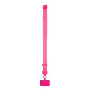 Cordão com alça ajustável para celular feito em poliéster. O acessório é fixado a um cartão retangular que se encaixa na parte interna da capa do celular, próximo à entrada de carregamento USB.