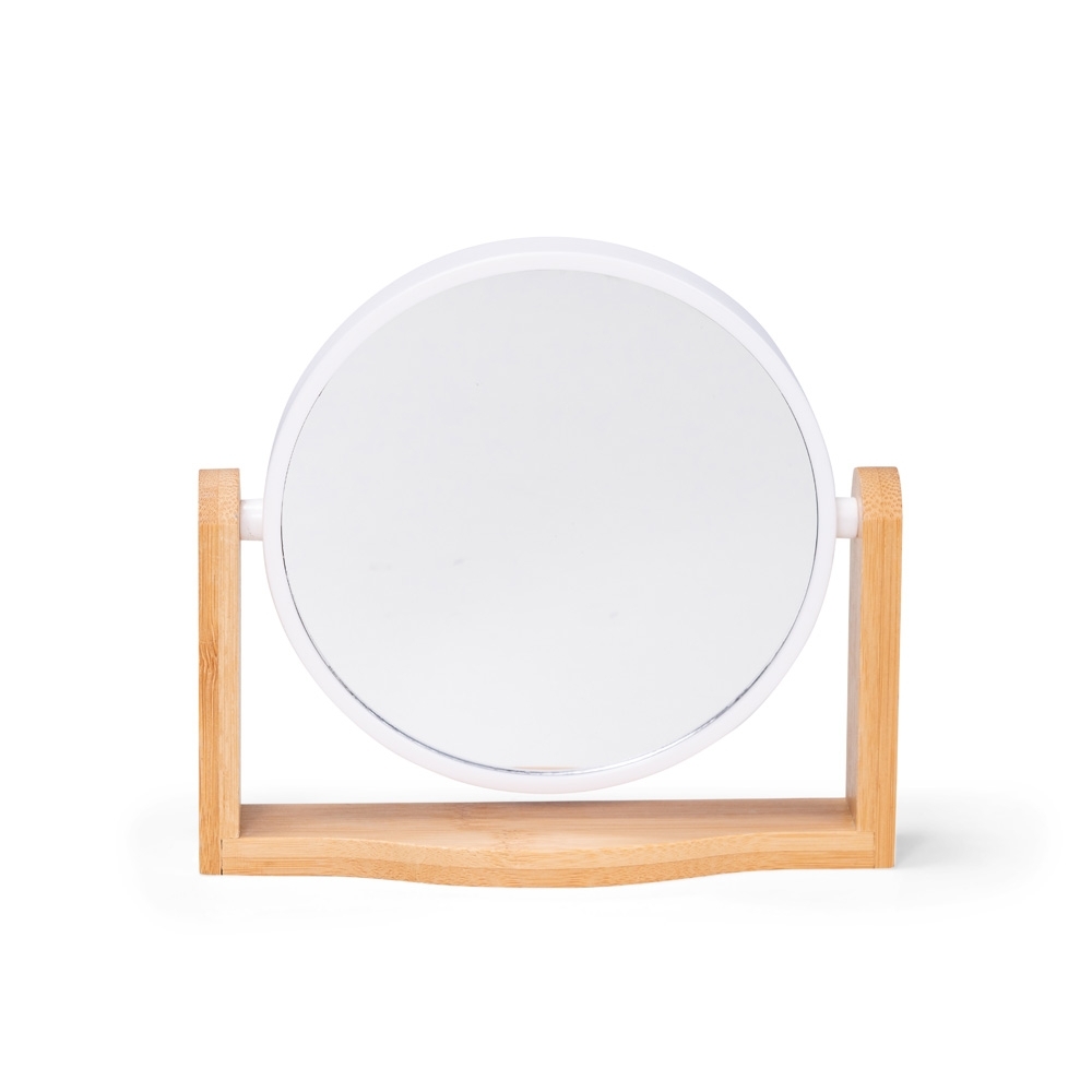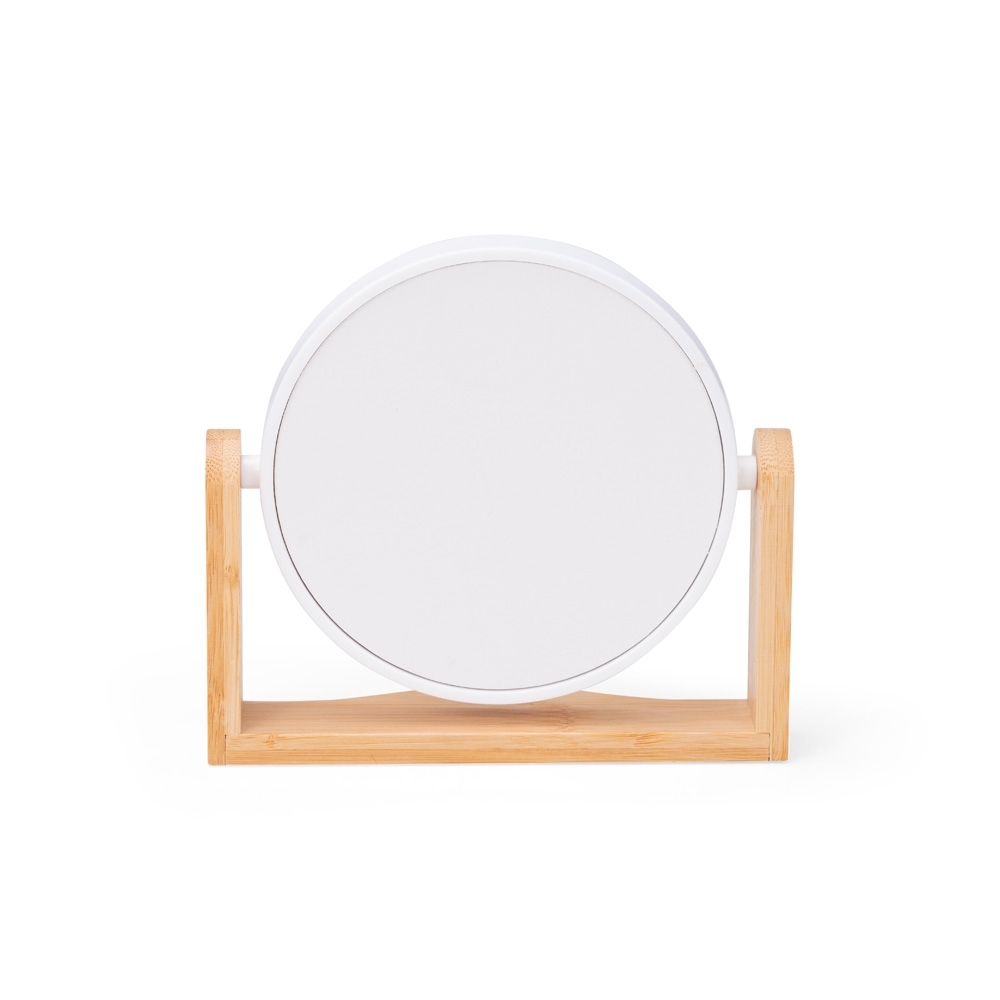 Espelho giratório com base em bambu e moldura em plástico.