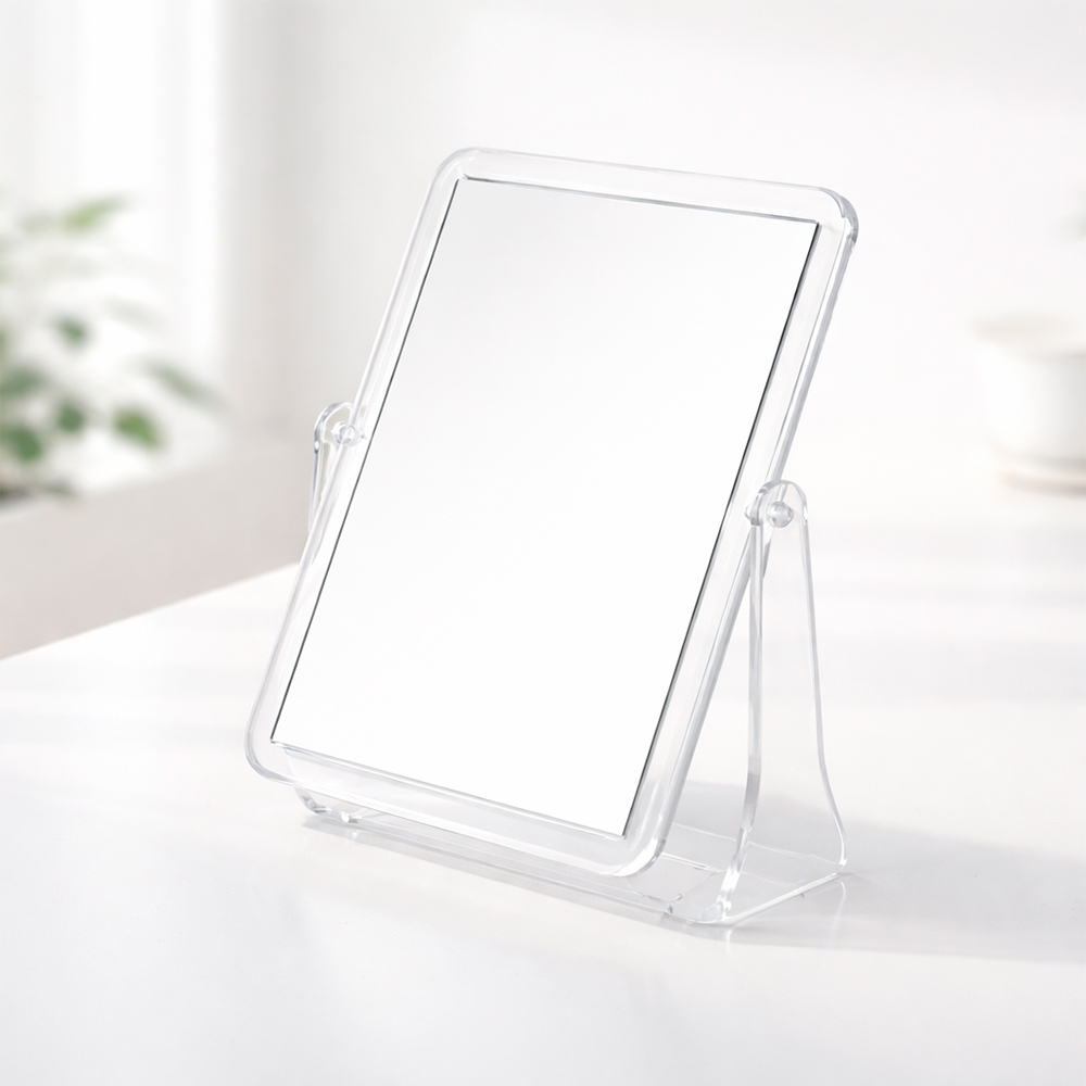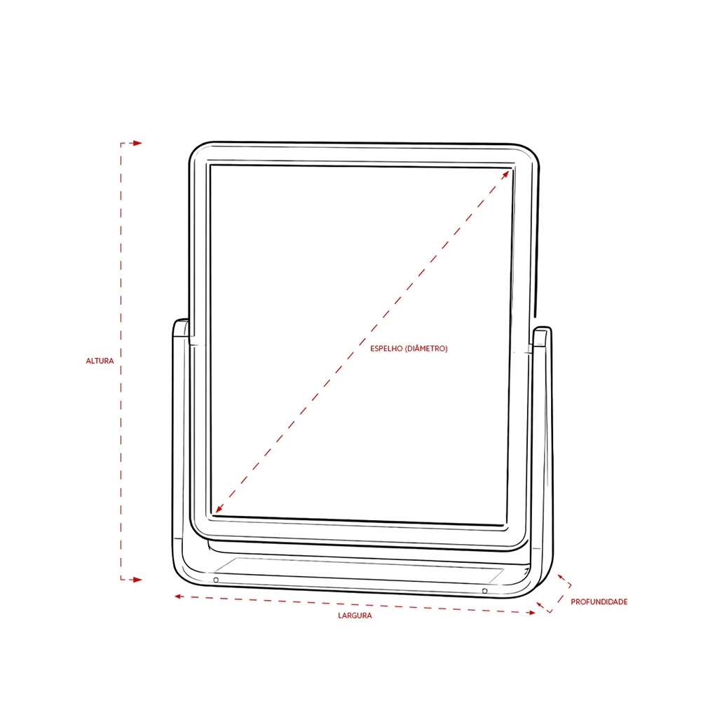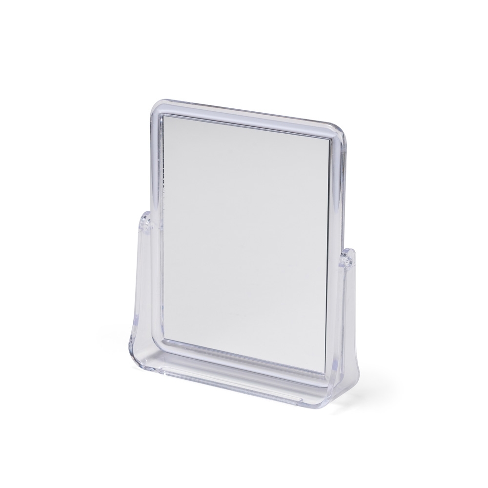 Descrição: Espelho de mesa retangular giratório com face dupla sem aumento e estrutura em plástico polipropileno (PP) transparente.