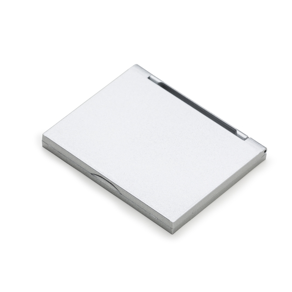 Espelho retangular duplo sem aumento, material em plástico resistente com uma faixa na superfície e verso liso.