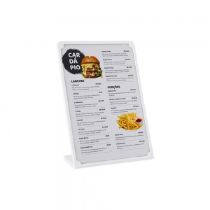 Expositor porta retrato A6 feito em poliestireno com placa acrílica.