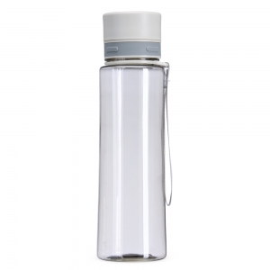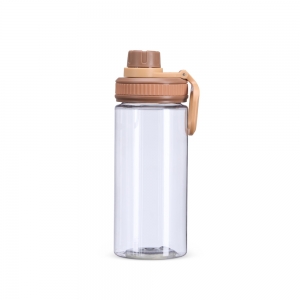 Garrafa plástica de 750ml com tampa rosqueável e bocal, tampa protetora e alça para facilitar o transporte.