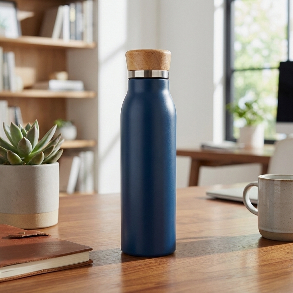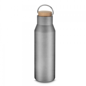 Garrafa térmica feita em inox com pintura em spray, tampa rosqueável em bambu e capacidade máxima de 600ml. Possui estrutura de parede dupla e isolamento a vácuo, permitindo manter a temperatura de líquidos por mais tempo.