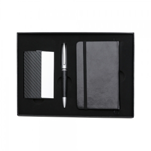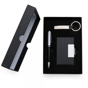 Kit executivo com 2 peças em estojo preto de papelão revestido com espuma interna. Possui uma caneta metal esfero laser e lanterna, clip metal e ao lado desenhos indicativos referente as funções, contém dois anéis prata, sendo o primeiro ao desrosquear fica o compartimento das baterias(acompanha 3 baterias CNB G3A) e o segundo anel é uma tampa com ponta touch, basta puxá-la para utilizar a caneta esfero. Porta cartão em couro sintético com detalhes em metal espelhado, parte interna revestida com veludo.