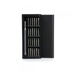 Kit ferramenta 24 peças em estojo de couro sintético. Possui: 5 extensores bocais(6MM, 7MM, 8MM, 9MM e 10MM), 3 tamanhos de chave Allen, trena de 1 metro(sem trava), 1 chave Philips, 1 chave Fenda, conjunto 10 pontas(4 chaves phillips, 2 chaves fenda, 3 chaves torx e um adaptador), chave auxiliar, chave que alonga ferramenta e alicate. Estojo de couro sintético com zíper e parte interna revestida de espuma.