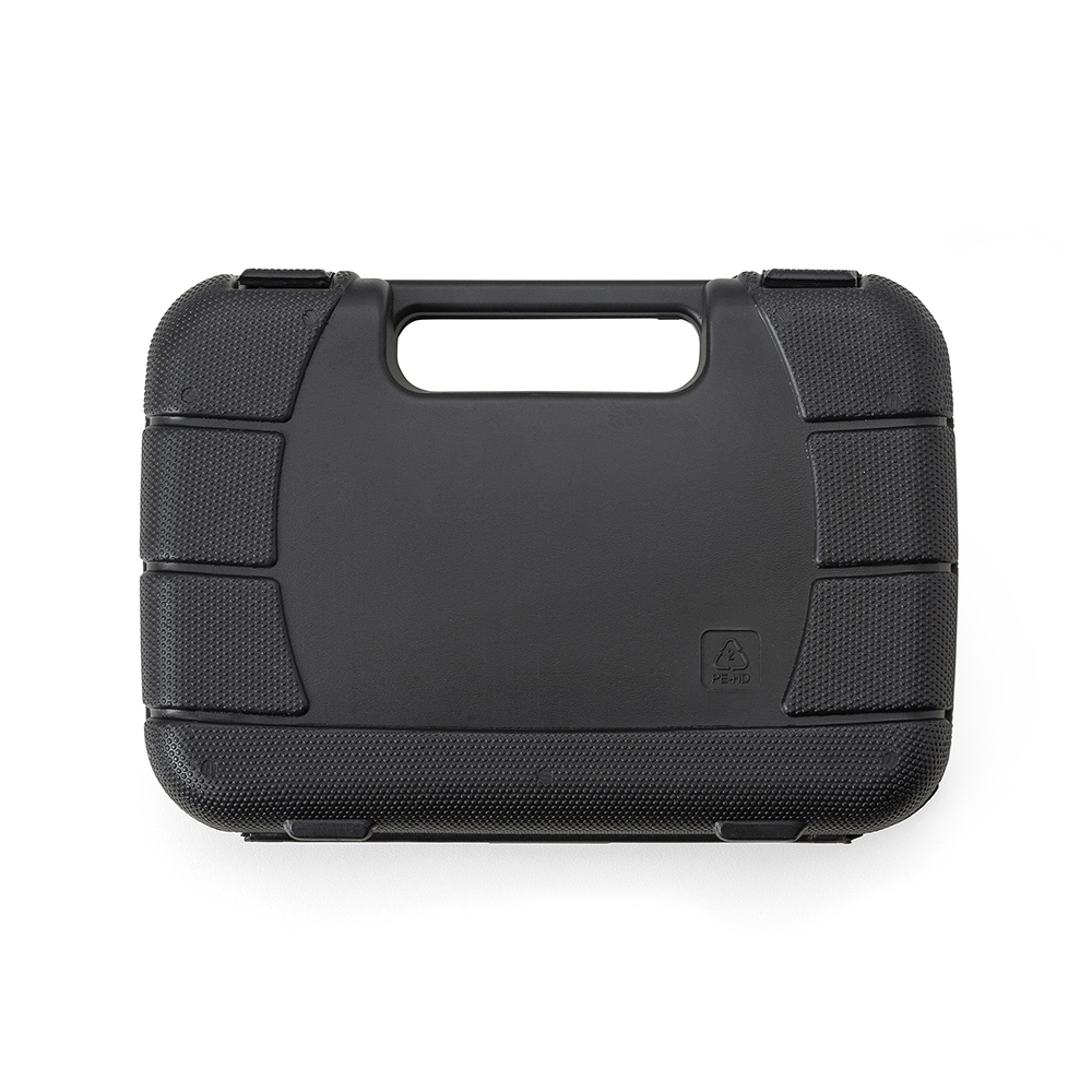 Kit ferramenta 8 peças em estojo plástico. Maleta plástica com detalhe retangular no centro frontal e verso liso, possui texturização no estojo e duas travas superiores. Acompanha: fita isolante, martelo, alicate, chave Philips, chave teste, chave de fenda, trena 2 metros e estilete.